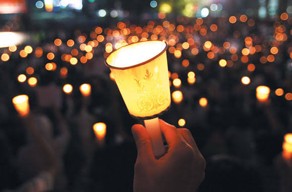 그로부터 정확히 8년전 박근혜 탄핵 시위 때 이 노래를 부르며 촛불을 켜는 모습
