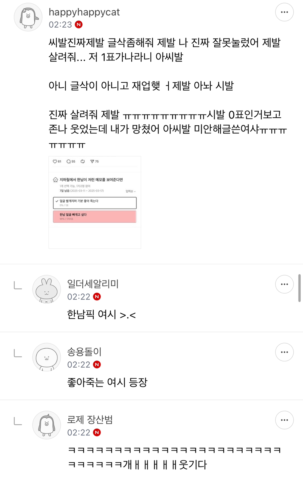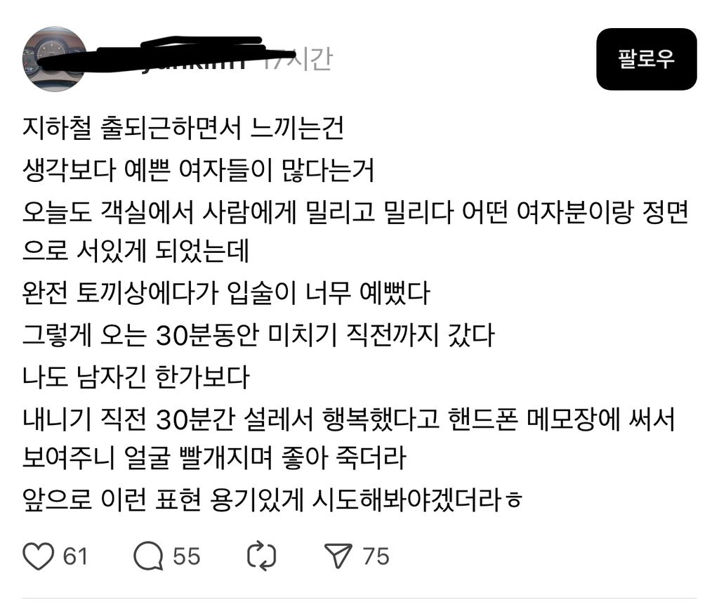 [칵.cxxx]지하철 출퇴근하면서 예쁜 여자가 많다는걸 느꼈다는 한남 작성자하바나99|작성시간25.03.11|조회수49,669 목록 댓글 373 글자크기 작게가 글자크기 크게가 출처: https://www.threads.net/@seyunkim1/post/DG_1fGaTKj8 다음검색 현재 게시글 추가 기능 열기 북마크 공유하기 신고 센터로 신고 댓글 댓글 373 댓글쓰기 답글쓰기 댓글 리스트 작성자바이 여친 | 작성시간 25.03.11 바로 신고함 이미지 확대 답댓글 작성자눈누으재 | 작성시간 25.03.12 이 글? 답댓글 작성자바이 여친 | 작성시간 25.03.12 눈누으재 저 인간 글ㅋㅋㅋㅋㅋㅋㅋ ㅠㅜ 작성자덜일하고많이 | 작성시간 25.03.11 화나서 빨개졌겠지 개빡쳐ㅠ 작성자고구려사람 | 작성시간 25.03.11 신고했당 댓글 전체보기