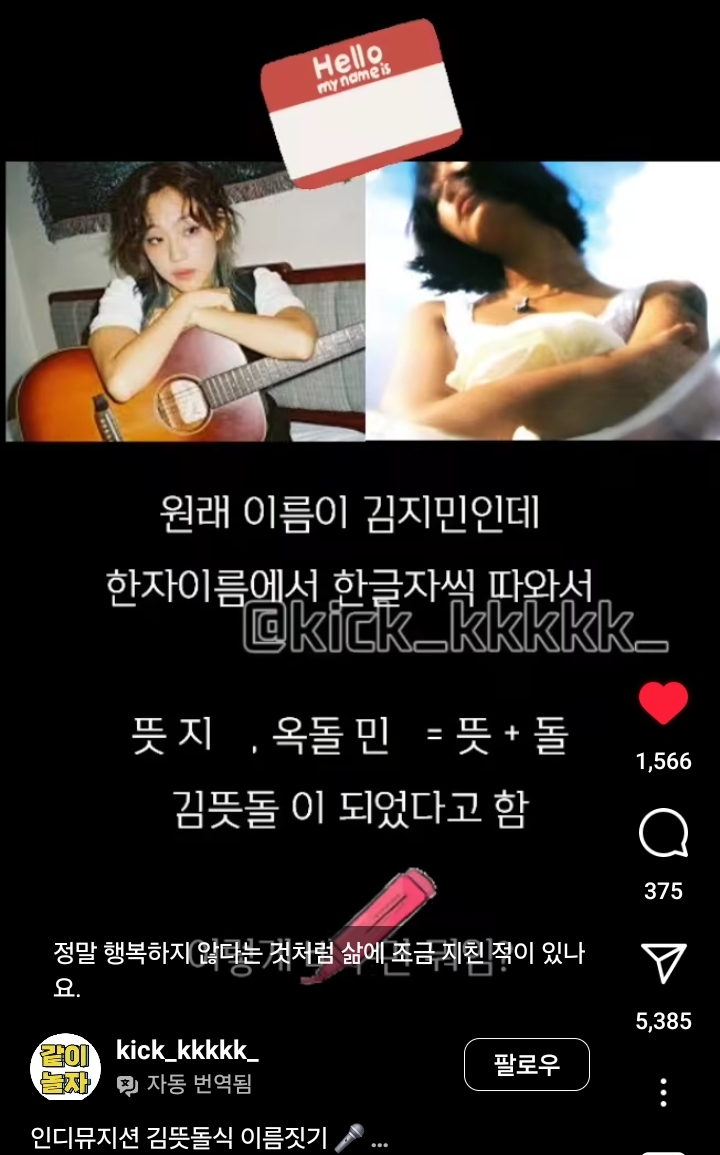 [흥미돋]인디뮤지션식 이름짓기 김뜻돌(김지민) 작성자(본인 닉네임.|작성시간25.03.11|조회수29,033 목록 댓글 435 글자크기 작게가 글자크기 크게가 출처: https://www.instagram.com/reel/DGUaHdByrV_뜻 지옥돌 민김 뜻돌 다음검색 현재 게시글 추가 기능 열기 북마크 공유하기 신고 센터로 신고 댓글 댓글 435 댓글쓰기 답글쓰기 댓글 리스트 작성자별둥둥 | 작성시간 25.03.12 뜻두 뜻터... 작성자Inky Blue | 작성시간 25.03.12 연빛... ㄱㅊ한데? 작성자Homage | 작성시간 25.03.13 복우 ..; 작성자햄부기부기뱀뱀 | 작성시간 25.03.13 울보 작성자소금바게트빵 | 작성시간 25.05.11 해들 맘에드네 댓글 전체보기