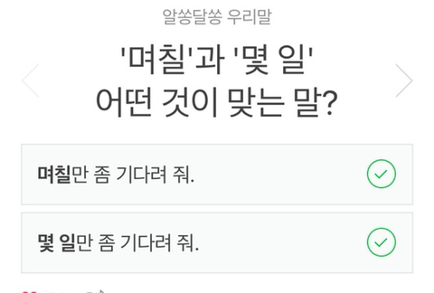 [스크랩] [흥미돋]몇일이라는 말은 없다고 무조건 며칠이야!!! 그럼 몇월 며칠날 만나?? 작성자리젤|작성시간25.03.11|조회수8,253 목록 댓글 16 글자크기 작게가 글자크기 크게가 출처 : 여성시대 ssssharpie며칠 vs 몇일며칠(ㅇ)며칠만 좀 기다려줘(ㅇ)그렇다면 며칠날vs 며칟날???며칟날(ㅇ)며칠날이라고 쓰다가 아닌거 발견해서 씀문제시 삭제.. 다음검색 스크랩 원문 : *여성시대* 차분한 20대들의 알흠다운 공간 현재 게시글 추가 기능 열기 북마크 공유하기 신고 센터로 신고 댓글 댓글 16 댓글쓰기 답글쓰기 댓글 리스트 작성자일빠는 눈치챙겨 | 작성시간 25.03.11 며칟날 작성자Zhāng Hào | 작성시간 25.03.11 몇일이 무ㅏ냐고 진짜 ㅜㅜ 넘 닺닺 삭제된 댓글입니다. 답댓글 작성자리젤 작성자 본인 여부 작성자 | 작성시간 25.03.11 그럼 여시가 저거 보여주면서 꼽줘 ㅋ_ㅋ 작성자당쇼쇼 | 작성시간 25.03.11 대박 배워간다 댓글 전체보기