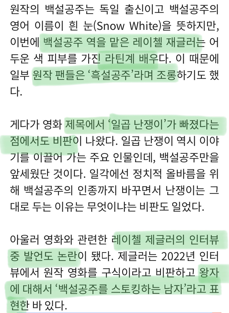 작성자징글벨징글 작성시간 25.03.13 우리나라에서만 그런건 아니네 근데 난 백설공주는 무리수였다고 생각하긴 함 인어공주야 뭐 어떤 인종, 피부색이 확연히 정해져잇던 건 아니지만(디즈니 애니 말고) 원작설정도, 주인공 이름도 하얀 피부색이 떠오를수밖에 없는 요소인데... 작품 핵심요소까지 바꾸면서 리메이크하는 건 당연히 반발을 불러오지 그렇다고 도넘은 한남식 혐오발언에 동의하는 건 아니지만