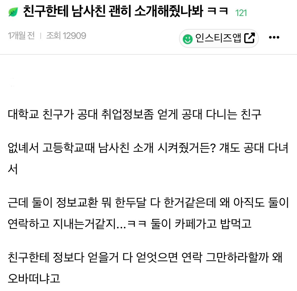 [스크랩] [흥미돋]친구한테 남사친 괜히 소개해줬나봐 ㅋㅋ 작성자어이김또깡|작성시간25.03.11|조회수11,521 목록 댓글 40 글자크기 작게가 글자크기 크게가 출처: https://www.instiz.net/name/61847330 다음검색 스크랩 원문 : *여성시대* 차분한 20대들의 알흠다운 공간 현재 게시글 추가 기능 열기 북마크 공유하기 신고 센터로 신고 댓글 댓글 40 댓글쓰기 답글쓰기 댓글 리스트 작성자불주먹쌔리기 | 작성시간 25.03.11 통제형 남미새넼ㅋㅋㅋㅋㅋㅋ 작성자망치로한남뚝배기 | 작성시간 25.03.11 역시 찐은 못이김 작성자주먹밥 | 작성시간 25.03.11 왜저래....ㅋㅋㅋㅋ 작성자삶은투쟁 | 작성시간 25.03.11 좋아하네~~~~ 작성자깐쇼새우 | 작성시간 25.03.12 뭐야..ㅋㅋㅋㅋ 남사친 좋아했나봄 댓글 전체보기