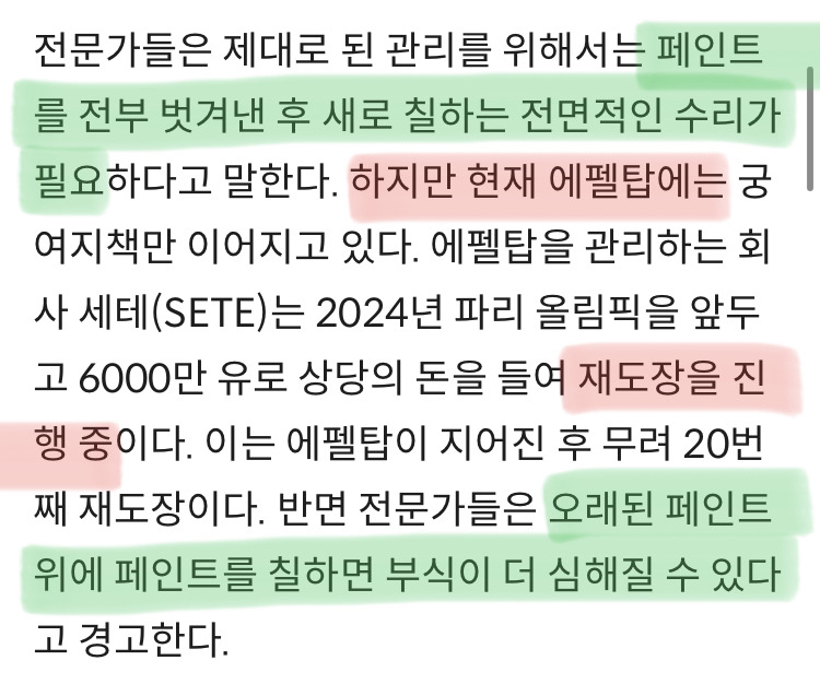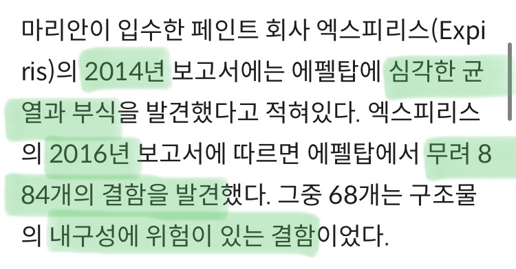 [기타]상태 심각한 에펠탑 현재 상태 작성자(본인닉네임).|작성시간25.03.11|조회수58,145 목록 댓글 37 글자크기 작게가 글자크기 크게가 출처: https://m.mk.co.kr/news/culture/10387747저러다 무너져서 사고라도 나면 어쩌려고.. 다음검색 현재 게시글 추가 기능 열기 북마크 공유하기 신고 센터로 신고 댓글 댓글 37 댓글쓰기 답글쓰기 댓글 리스트 작성자실연자협회 | 작성시간 25.03.11 허물고 다시 지어~ 작성자반이바니바니반이 | 작성시간 25.03.11 얼마전에 갔다왔는데 무사한거에 감사해야겠네....하긴 겨울에도 줄 엄청 서있고 올라가니 사람 더 많드만 그 수입 포기하기 싫겠지....ㅉ 작성자엡앤플로우 | 작성시간 25.03.11 유럽 후손들은 다 빡대갈같애 작성자A Star Is Born | 작성시간 25.03.11 코로나 때 좀 하지 작성자니얼굴더블더블 | 작성시간 25.03.12 큰일난다고요.. 댓글 전체보기