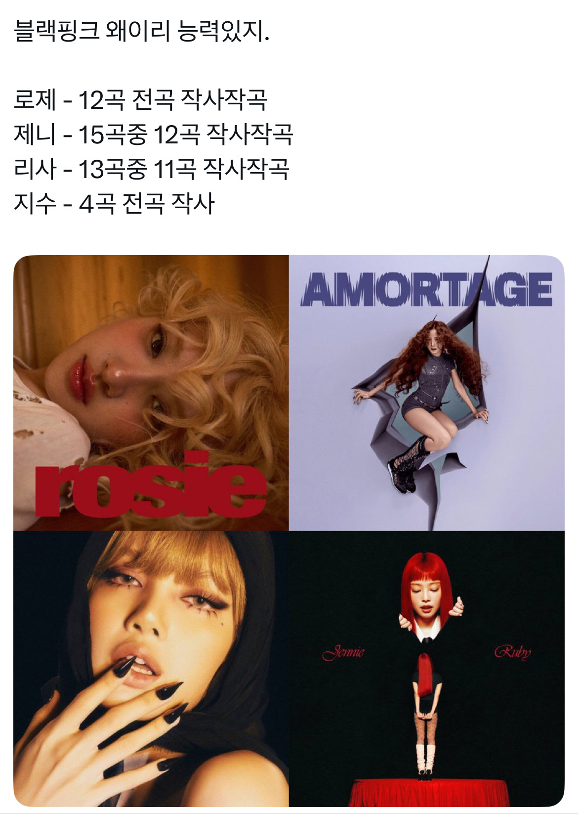 [흥미돋]블랙핑크 왜이리 능력있지.twt 작성자nero|작성시간25.03.11|조회수18,988 목록 댓글 26 글자크기 작게가 글자크기 크게가 출처: https://x.com/energysobi/status/1898218946656190912?s=46하,,,이느좋녀들블핑 지수 제니 리사 로제 다음검색 현재 게시글 추가 기능 열기 북마크 공유하기 신고 센터로 신고 댓글 댓글 26 댓글쓰기 답글쓰기 댓글 리스트 작성자tchalamet | 작성시간 25.03.11 미친 로제는 알았어도 제니랑 리사는 첨 알았어 퀄 미쳤다고….. 작성자R=VD건강 | 작성시간 25.03.12 로제 전곡 작사작곡이라고?? 미쳤다 작성자호이짯 | 작성시간 25.03.12 오래오래 음악해줬으면 작성자자몽허니블랙티샷추가 | 작성시간 25.03.12 블핑 사랑해 작성자The Band CAMINO | 작성시간 25.03.12 멋있다 댓글 전체보기