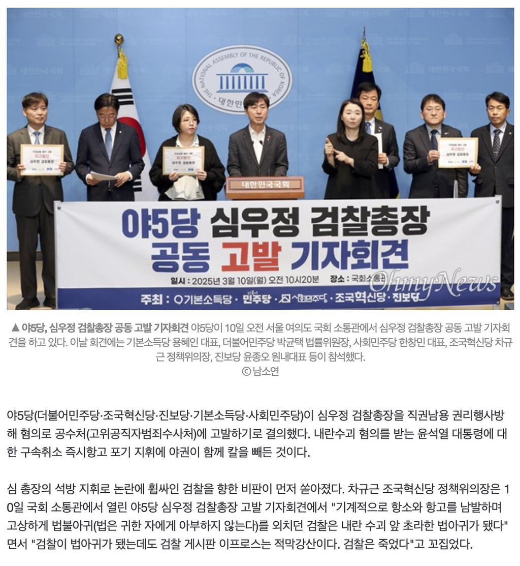 [여시뉴스데스크]"적막강산 이프로스,검찰은 죽었다"...야5당, 심우정 총장 고발 작성자고양이가방에들어가신다|작성시간25.03.11|조회수584 목록 댓글 1 글자크기 작게가 글자크기 크게가 출처: https://n.news.naver.com/mnews/article/047/0002465228?sid=100"적막강산 이프로스,검찰은 죽었다"...야5당, 심우정 총장 고발▲ 야5당, 심우정 검찰총장 공동 고발 기자회견 야5당이 10일 오전 서울 여의도 국회 소통관에서 심우정 검찰총장 공동 고발 기자회견을 하고 있다. 이날 회견에는 기본소득당 용혜인 대표, 더불n.news.naver.com 다음검색 현재 게시글 추가 기능 열기 북마크 공유하기 신고 센터로 신고 댓글 댓글 1 댓글쓰기 답글쓰기 댓글 리스트 작성자알러지프리 | 작성시간 25.03.11 고발ㄴㄴ 그냥 탄핵 시킵시다~~~~~ 댓글 전체보기