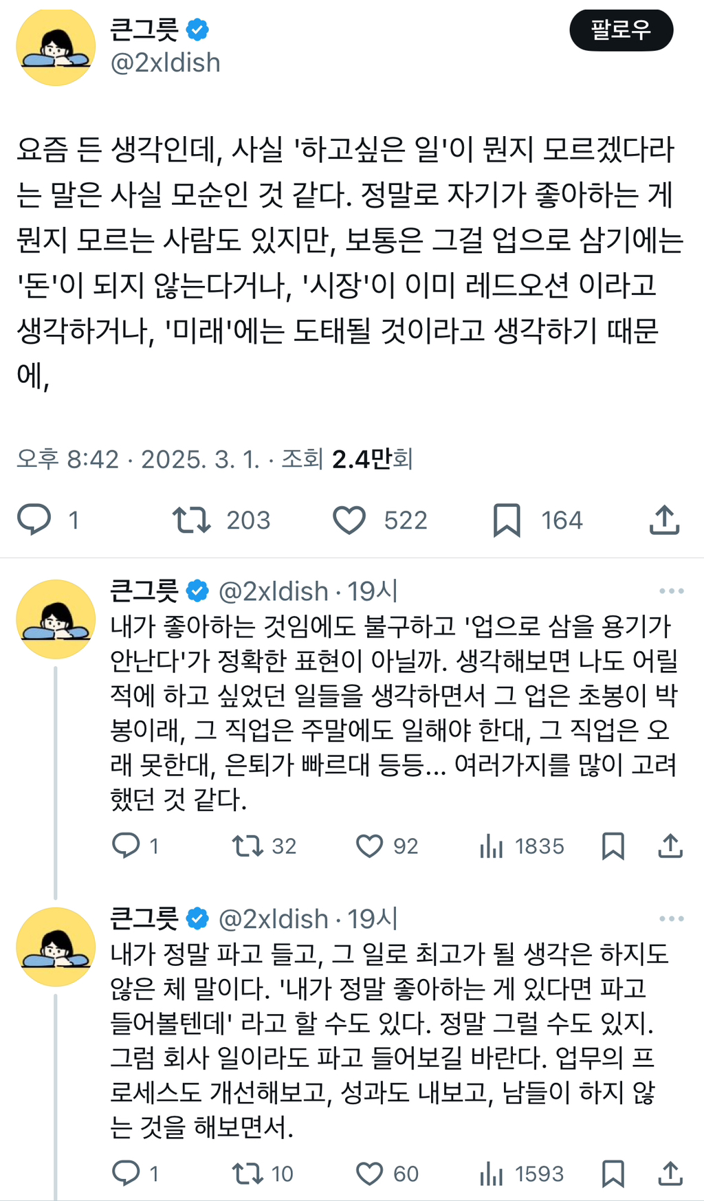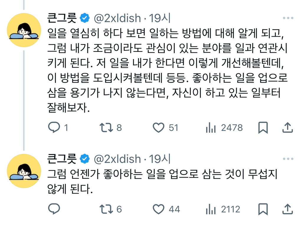 지금 하는 일 좋아하고 열심히 하기는 하는데 개큰 열정은 없어 걍 어차피 하는 김에 열심히 하는거지..