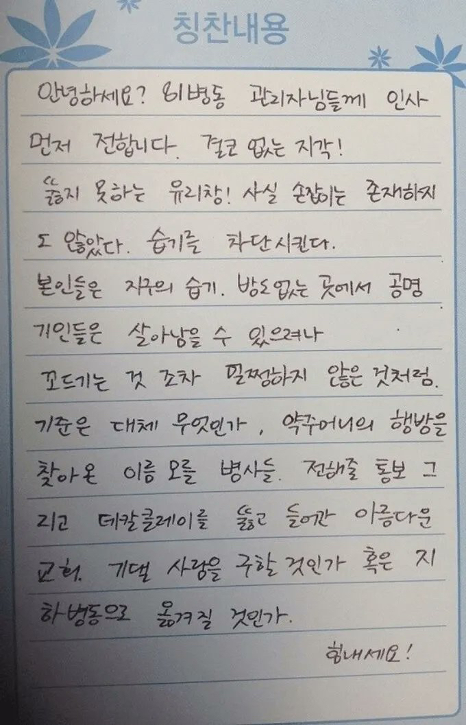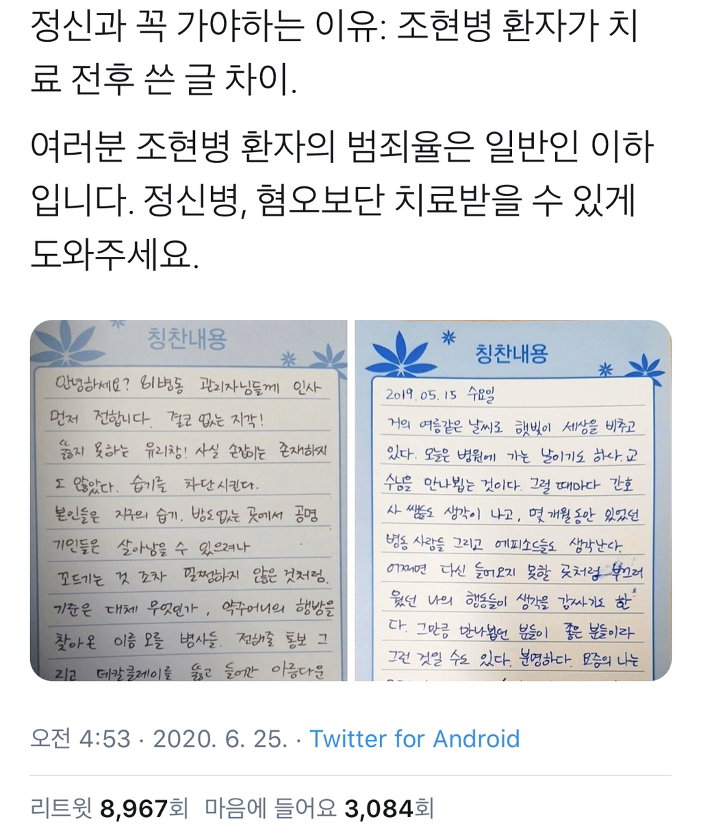 [스크랩] [흥미돋]정신과 꼭 가야하는 이유: 조현병 환자가 치료 전후 쓴 글 차이.twt 작성자모든게다귀찮은여시|작성시간25.03.11|조회수25,033 목록 댓글 16 글자크기 작게가 글자크기 크게가 출처 : https://twitter.com/yucksb/status/1275879712720551936?s=21 다음검색 스크랩 원문 : *여성시대* 차분한 20대들의 알흠다운 공간 현재 게시글 추가 기능 열기 북마크 공유하기 신고 센터로 신고 댓글 댓글 16 댓글쓰기 답글쓰기 댓글 리스트 작성자낭만이 밥 먹여주지 | 작성시간 25.03.11 첫번째 편지 되게 시 같다... 작성자star난바 | 작성시간 25.03.11 와 근데 책 진짜 많이 읽으셨나 되게 소설읽는거같애 (치료후) 작성자로청 | 작성시간 25.03.11 근데 후자도 보면 글솜씨가 ㄹㅇ 예사롭지 않음 작성자7211 | 작성시간 25.03.11 치료 전 현대시 같아 ㅋㅋㅌㅌㅋ 작성자알밤크림빵 | 작성시간 25.03.12 조현병 치료한 사람들은 자기가 전에 썻던 글 보면 무슨 생각이 들까? 댓글 전체보기