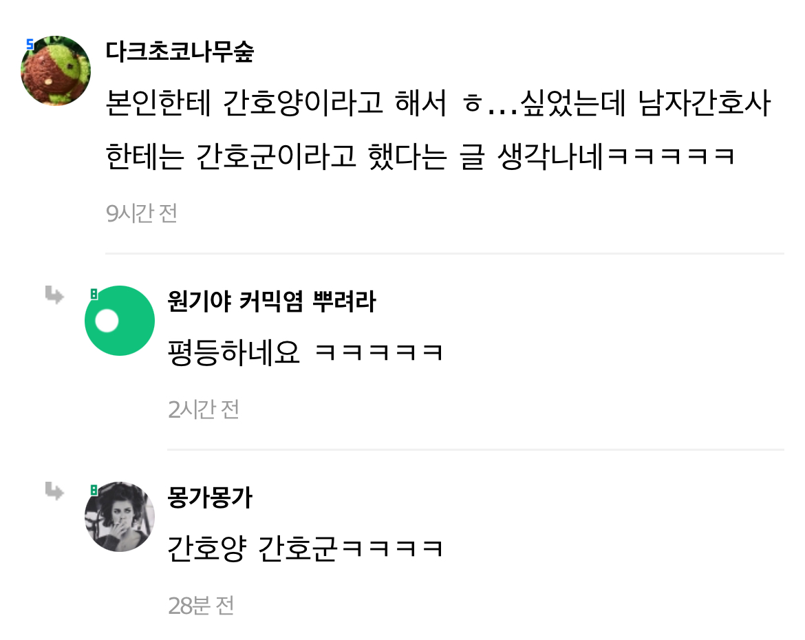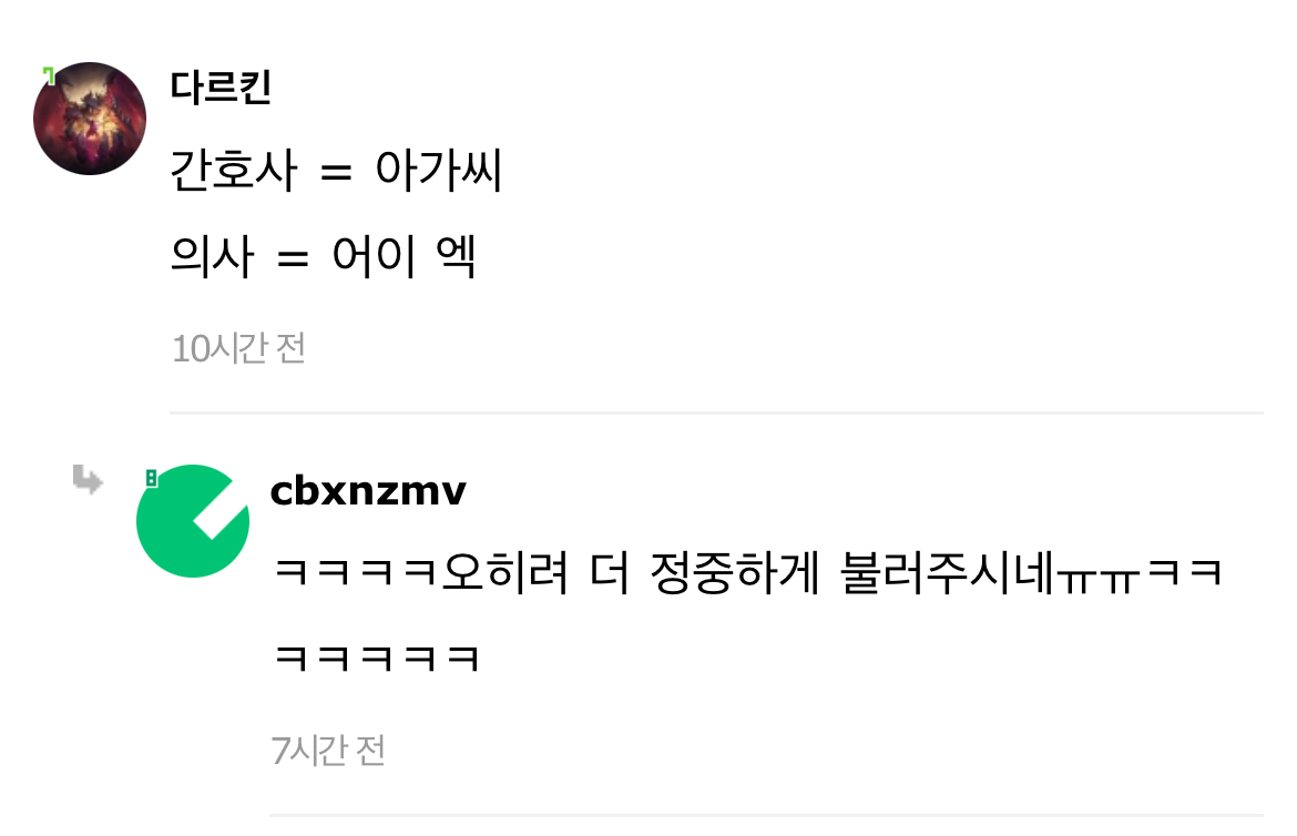 [스크랩] [흥미돋]간호산데 나도 그런거 있음ㅋㅋㅋ 할배가 아가씨 이러길래 작성자natural|작성시간25.03.11|조회수80,406 목록 댓글 81 글자크기 작게가 글자크기 크게가 출처: 여성시대 설리야https://www.instiz.net/pt/7543701간호산데 나도 그런거 있음ㅋㅋㅋ 할배가 아가씨 이러길래 - 인스티즈(instiz) 이슈 카테고리여기 아가씨 없구요 간호사라고 불러주세요 이러면서 짜증냈는데의사한테 어이!!!! 액!!!! 이런식으로 부르는거 보고헛웃음남ㅋㅋㅋㅋwww.instiz.net 다음검색 스크랩 원문 : *여성시대* 차분한 20대들의 알흠다운 공간 현재 게시글 추가 기능 열기 북마크 공유하기 신고 센터로 신고 댓글 댓글 81 댓글쓰기 답글쓰기 댓글 리스트 작성자방지민 | 작성시간 25.03.11 아 개웃겨ㅋㅋㅋㅋㅋㅋㅋㅋㅋㅋㅋㅋㅋㅋㅋㅋㅋㅋㅋ 작성자내가 바라는대로 다 이루어진다 | 작성시간 25.03.12 간호군이 ㅈㄴ웃겨ㅋㅋㅋㅋㅋ 작성자단발머리소녀 | 작성시간 25.03.18 간호군 진짴ㅋㅋㅋㅋㅋㅋㅋㅋㅋㅋㅋㅋ 작성자후루룩꾹꾹국수 | 작성시간 25.03.18 의사는 때렼ㅋㅋㅋㅋㅋㅋㅋㅋㅋ 작성자모래알만한진실이라도 | 작성시간 25.03.28 간호양은 뭔가 포켓몬 간호순같고 귀엽네ㅋㅋㅋ 댓글 전체보기