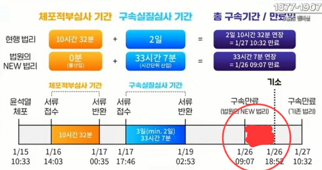 but, 더 말도 안 되는 것은 이번에 체포적부심기간을 구속기간에 산입했다는 것임(위 그림에서 주황색 구간에 해당) / 법원의 new 법리에서 0분이라고 되어 있는 이유는, 구속기간이 체포적부심기간만큼 연장되어야 하는데 연장 안시켰다는 것 👉 즉 총 구속기간에 체포적부심기간을 산입했다는 뜻