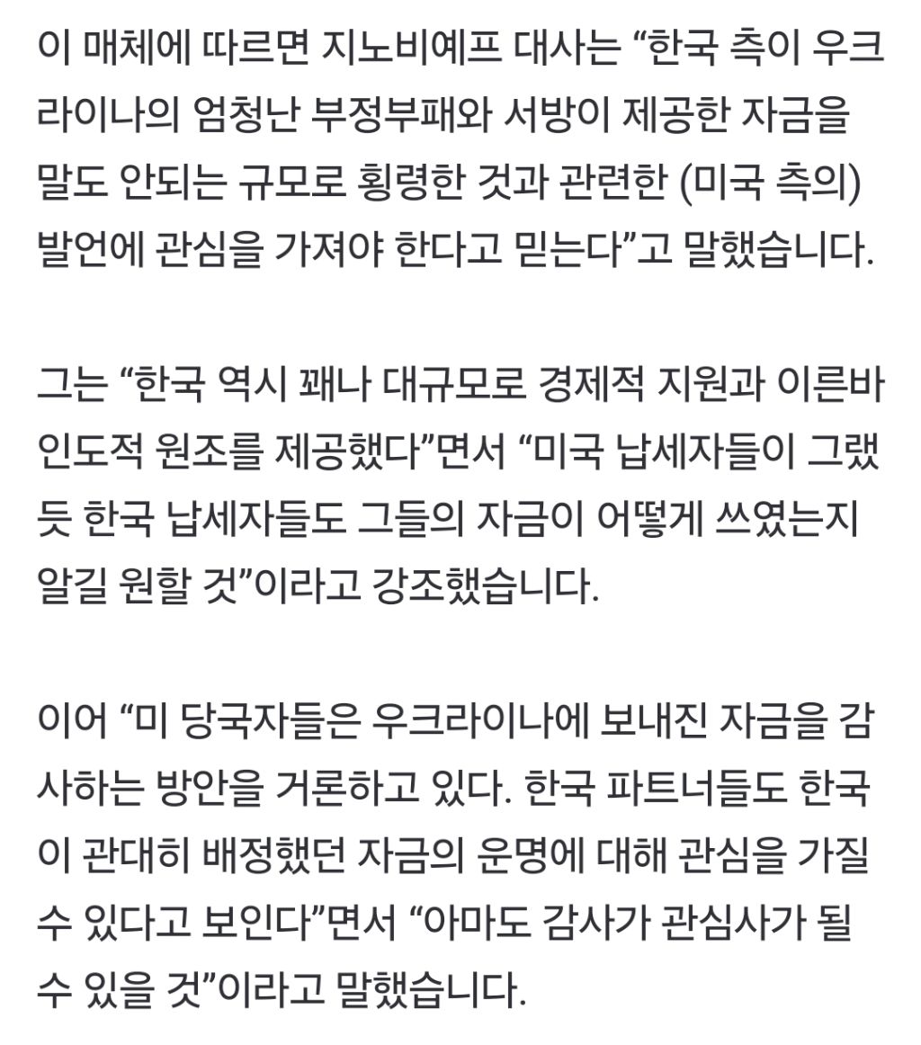 [여시뉴스데스크]주한 러대사 “한국인들, 우크라 지원금 사용처 알고싶을 것” 작성자아흐레|작성시간25.03.11|조회수3,058 목록 댓글 9 글자크기 작게가 글자크기 크게가 출처: https://naver.me/5oEnDHmU주한 러대사 “한국인들, 우크라 지원금 사용처 알고싶을 것”게오르기 지노비예프 주한 러시아 대사가 10일(현지시각) 한국 정부가 우크라이나에 제공한 지원금이 어떻게 쓰였는지에 대한 감사에 나설 것을 촉구했다고 타스 통신이 보도했습니다. 이 매체n.news.naver.com저걸 과연 우크라만 빼먹었을까?? 어디사는 부부도 같이 빼먹지 않았을까?? 다음검색 현재 게시글 추가 기능 열기 북마크 공유하기 신고 센터로 신고 댓글 댓글 9 댓글쓰기 답글쓰기 댓글 리스트 작성자지금지금지금 | 작성시간 25.03.11 알려줘 작성자카트리에일 | 작성시간 25.03.11 말만하지말고 알려줘봐 작성자이직이직 | 작성시간 25.03.11 뭐라고...횡령할게없어서 이딴걸 횡령한다고...우크라 정치인들도 개노답인데 심지어 우리나라의 ㅋㅋㅋㅋㅋ 하 이름을말할수없는 인간들도 횡령했다는 저 암시 ㅋㅋㅋㅋㅋㅋ 가관이다 작성자Plum Blossom | 작성시간 25.03.12 러시아 맞는 말하네;; 작성자바람이불다 | 작성시간 25.03.12 그래 알고싶다 댓글 전체보기