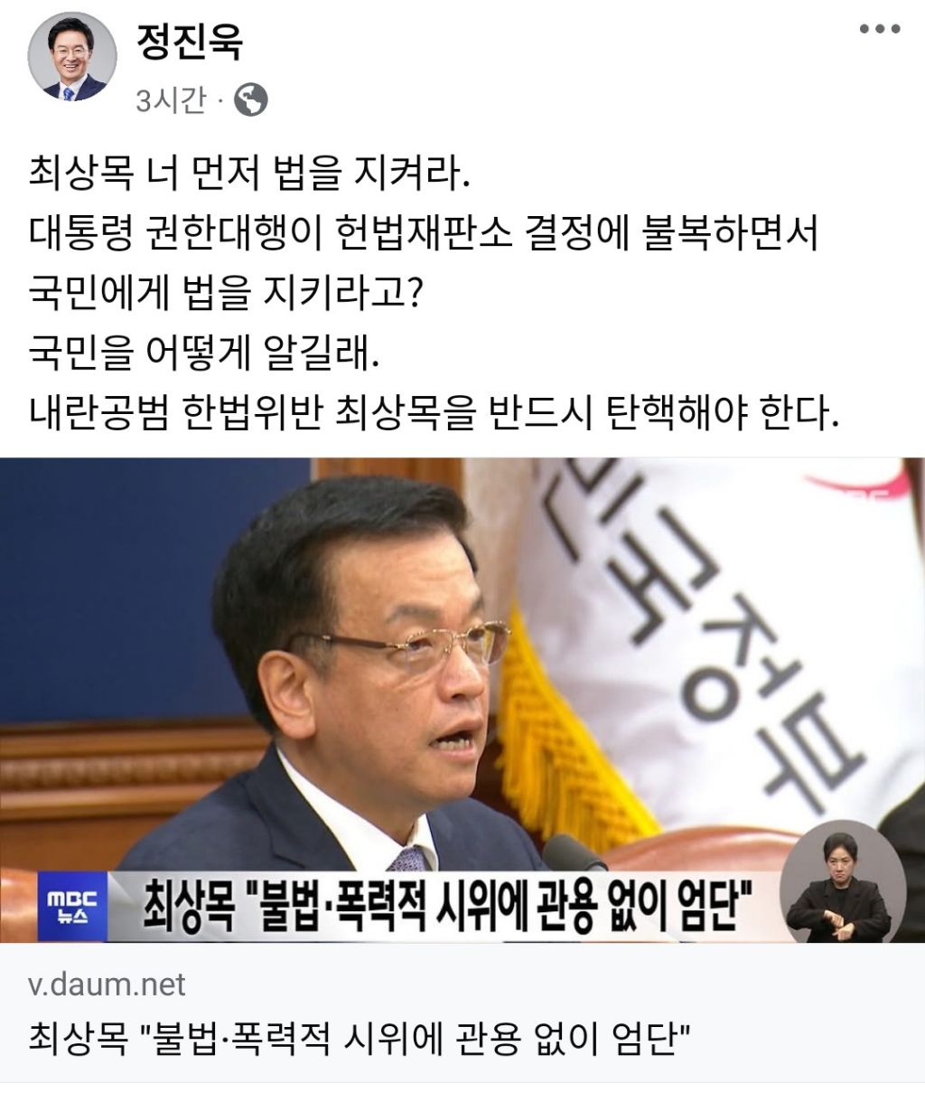 [흥미돋]정진욱 의원: 최상목 너 먼저 법 지켜라 작성자아흐레|작성시간25.03.11|조회수2,084 목록 댓글 5 글자크기 작게가 글자크기 크게가 출처: https://m.cafe.daum.net/rocksoccer/ADs1/1357894?svc=cafeapp 다음검색 현재 게시글 추가 기능 열기 북마크 공유하기 신고 센터로 신고 댓글 댓글 5 댓글쓰기 답글쓰기 댓글 리스트 작성자잣돌이 | 작성시간 25.03.11 진짜 내로남불뒤져ㅔ 작성자노란해바라기 | 작성시간 25.03.11 하목 작성자대원칼국수 | 작성시간 25.03.11 미친놈이야 작성자애경은살균제제주항공 | 작성시간 25.03.12 진짜 불법은 너가 제일 크고요 작성자말이안되죠 | 작성시간 25.03.12 개빡쳐 진짜 ㅜㅜ 댓글 전체보기