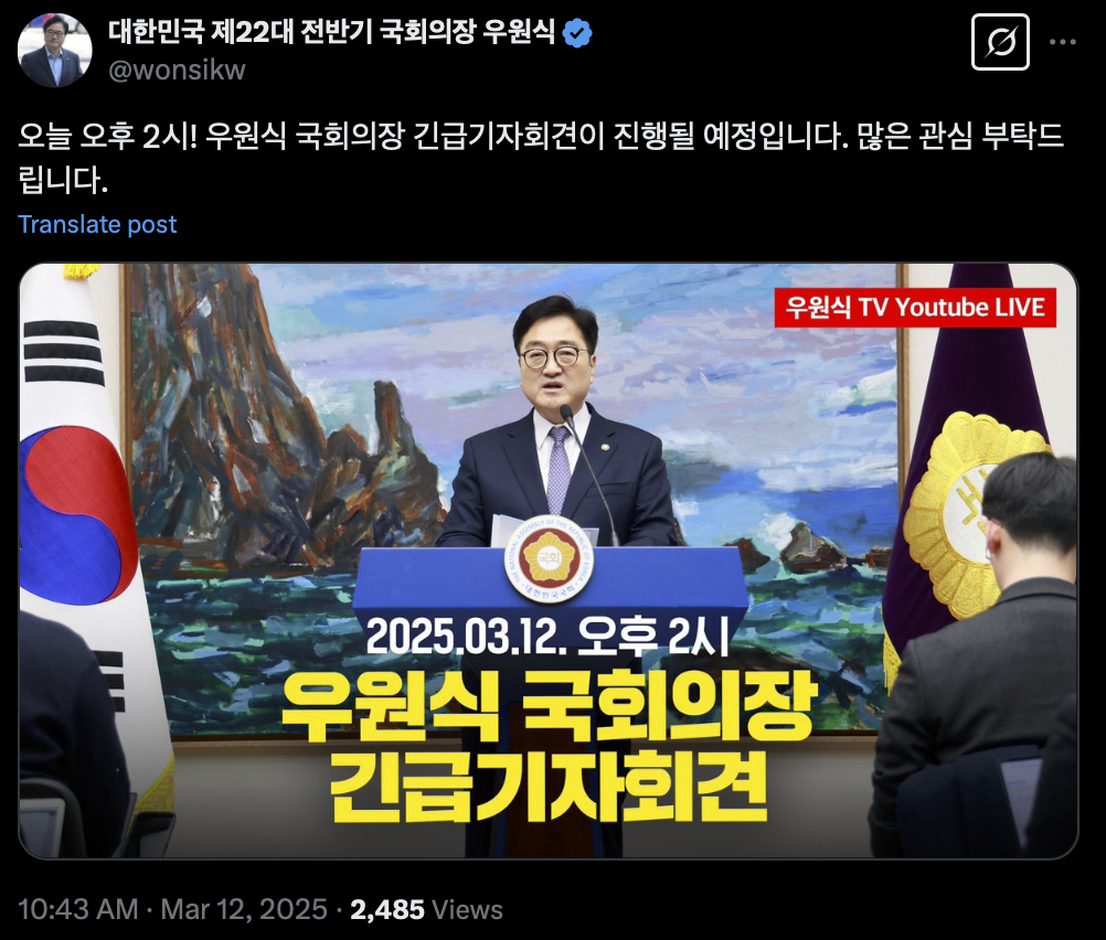 [기타]오늘 14시 우원식 국회의장 긴급기자회견!!!! 작성자고양이가방에들어가신다|작성시간25.03.12|조회수7,884 목록 댓글 67 글자크기 작게가 글자크기 크게가 출처: 여성시대 (고양이가방에들어가신다) https://x.com/wonsikw/status/1899637224536473846 다음검색 현재 게시글 추가 기능 열기 북마크 공유하기 신고 센터로 신고 댓글 댓글 67 댓글쓰기 답글쓰기 댓글 리스트 작성자느개비롯데리아작당모의 | 작성시간 25.03.12 무슨일이야.... 작성자고양이 | 작성시간 25.03.12 뭔데…ㅠㅠ 작성자닥터페퍼제로 | 작성시간 25.03.12 선물이거나 별일아닐듯 작성자개빡친민중의노래 | 작성시간 25.03.12 왜..뭔데...나무서워ㅠㅠㅠ 작성자일본죽이고조용히살기 | 작성시간 25.03.12 아오 진짜 열받아 국회의장이 얼마나 열받으면 이렇게까지 하냐ㅅㅂ미친새끼야 댓글 전체보기