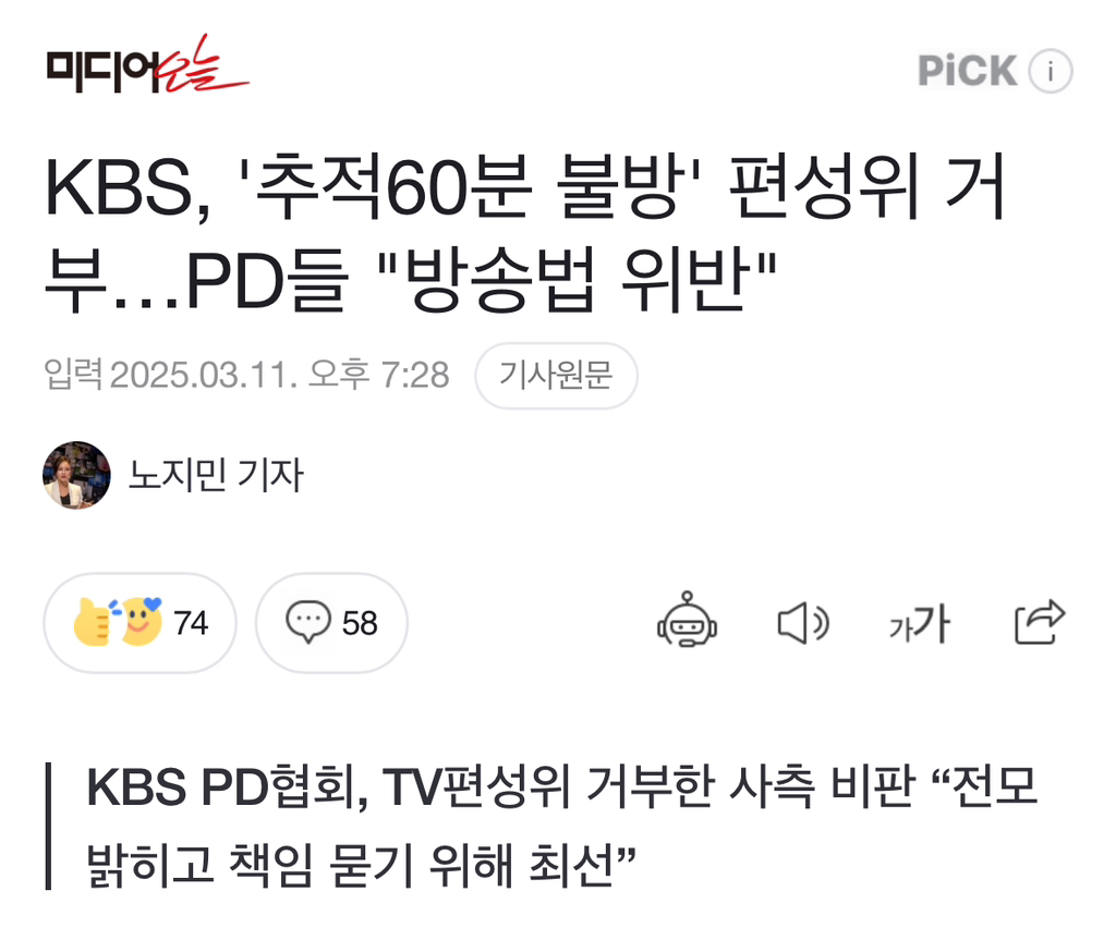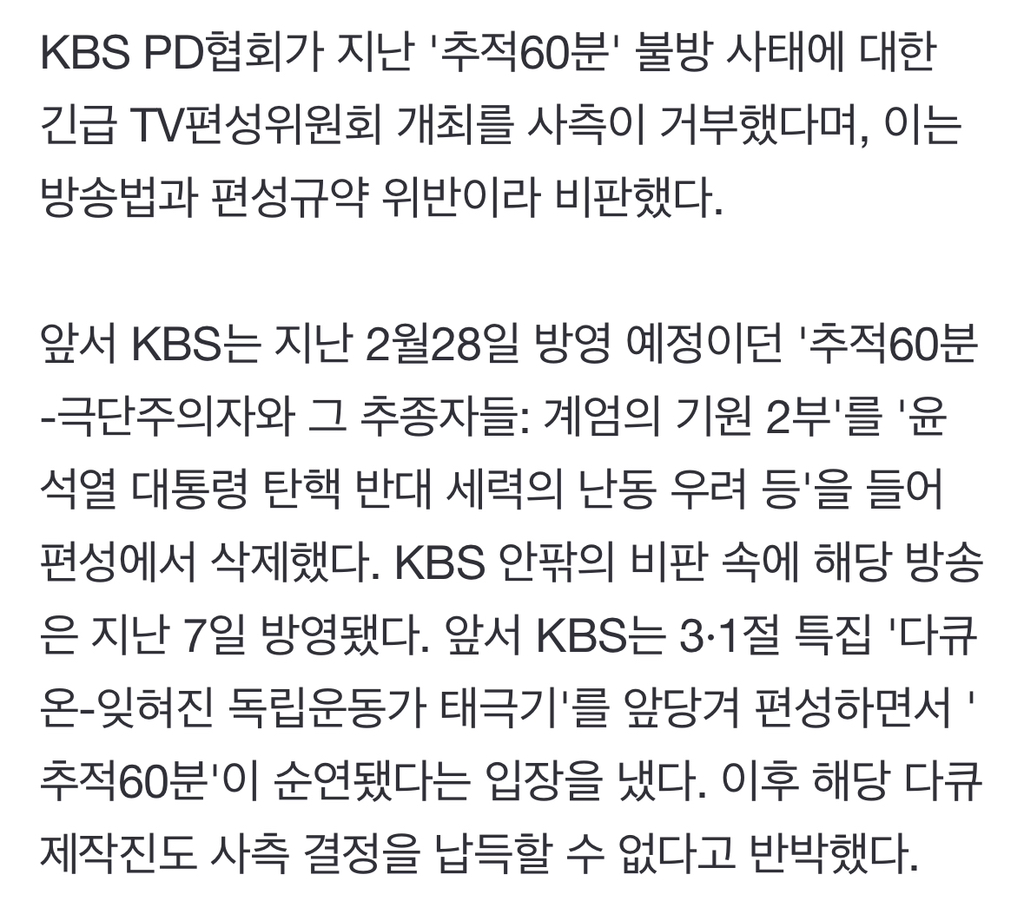 [여시뉴스데스크]KBS, '추적60분 불방' 편성위 거부…PD들 "방송법 위반" 작성자소리앙|작성시간25.03.12|조회수804 목록 댓글 1 글자크기 작게가 글자크기 크게가 출처: https://naver.me/5HklyLo2KBS, '추적60분 불방' 편성위 거부…PD들 "방송법 위반"KBS PD협회가 지난 '추적60분' 불방 사태에 대한 긴급 TV편성위원회 개최를 사측이 거부했다며, 이는 방송법과 편성규약 위반이라 비판했다. 앞서 KBS는 지난 2월28일 방영 예정이던 '추적60분-극단주n.news.naver.com전문출처 다음검색 현재 게시글 추가 기능 열기 북마크 공유하기 신고 센터로 신고 댓글 댓글 1 댓글쓰기 답글쓰기 댓글 리스트 작성자대통령 문재인 | 작성시간 25.03.12 구석구석구석 시발 썩음 댓글 전체보기