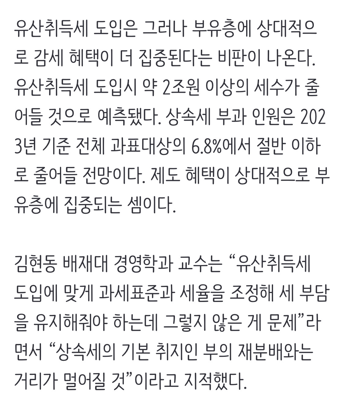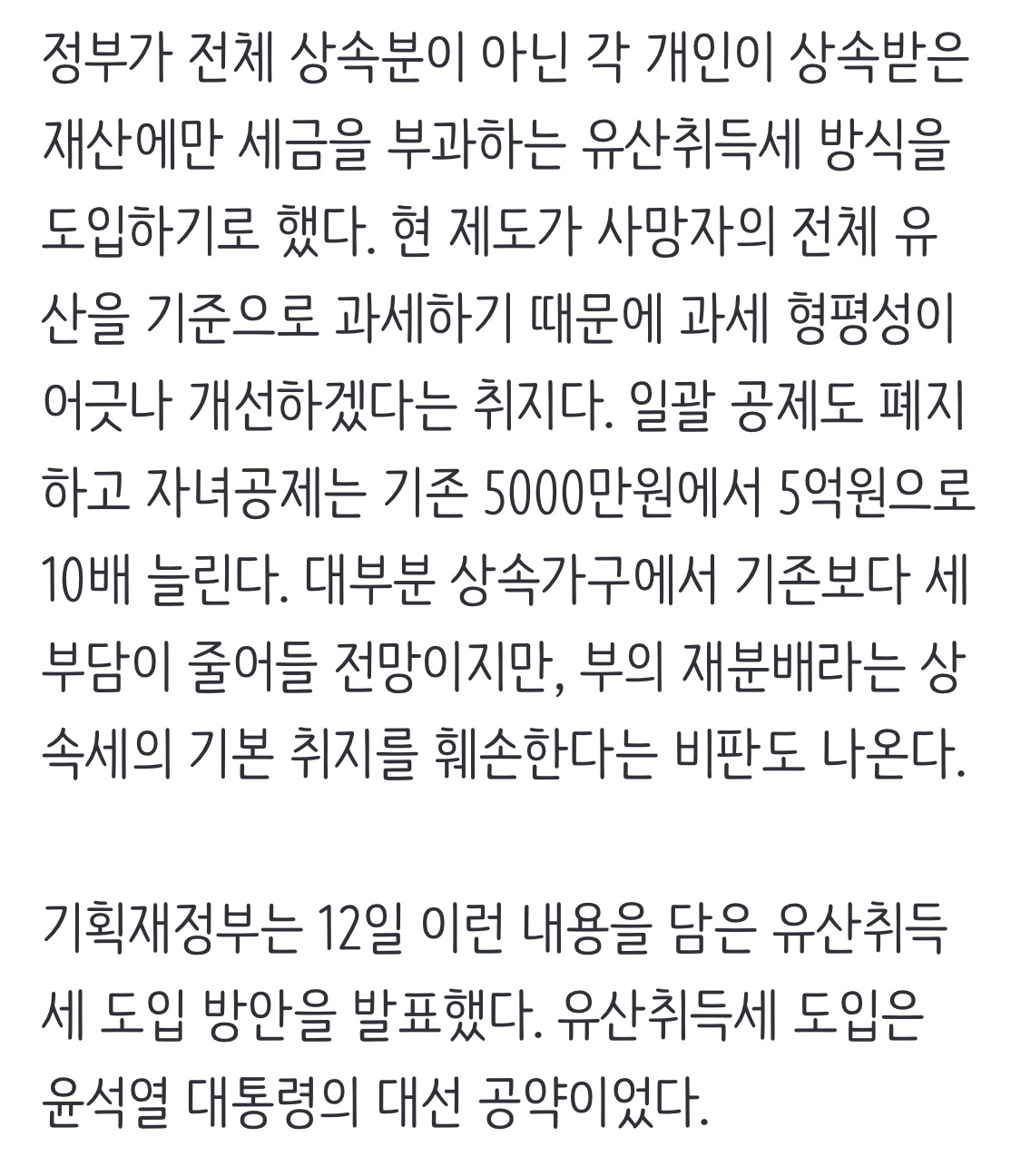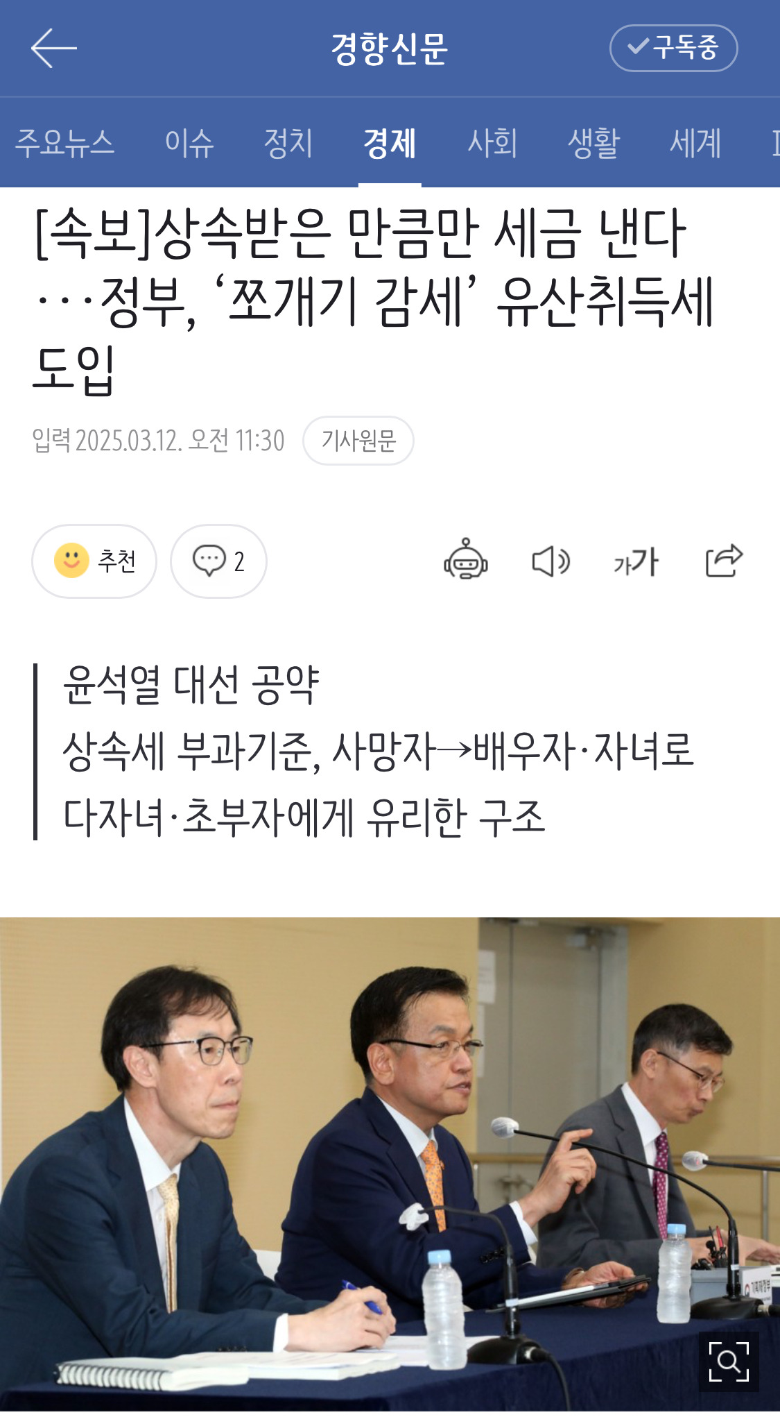 [여시뉴스데스크][속보]상속받은 만큼만 세금 낸다···정부, ‘쪼개기 감세’ 유산취득세 도입 작성자마라톤 준비생|작성시간25.03.12|조회수1,201 목록 댓글 1 글자크기 작게가 글자크기 크게가 출처: 여성시대 마라톤 준비생https://n.news.naver.com/article/032/0003356163?cds=news_edit[속보]상속받은 만큼만 세금 낸다···정부, 상속세 ‘유산취득세 방식’으로 개편정부가 전체 상속분이 아닌 각 개인이 상속받은 재산에만 세금을 부과하는 유산취득세 방식을 도입하기로 했다. 현 제도가 사망자의 전체 유산을 기준으로 과세하기 때문에 과세 형평성이 어긋n.news.naver.com 다음검색 현재 게시글 추가 기능 열기 북마크 공유하기 신고 센터로 신고 댓글 댓글 1 댓글쓰기 답글쓰기 댓글 리스트 작성자마루쫑쫑마루 | 작성시간 25.03.12 아니 ㅋㅋㅋ 정작 서민들이 많이 내는 증여세 개편은 하지도 않고 상속세 개편만 하는게 너무 속보이는데..? 댓글 전체보기