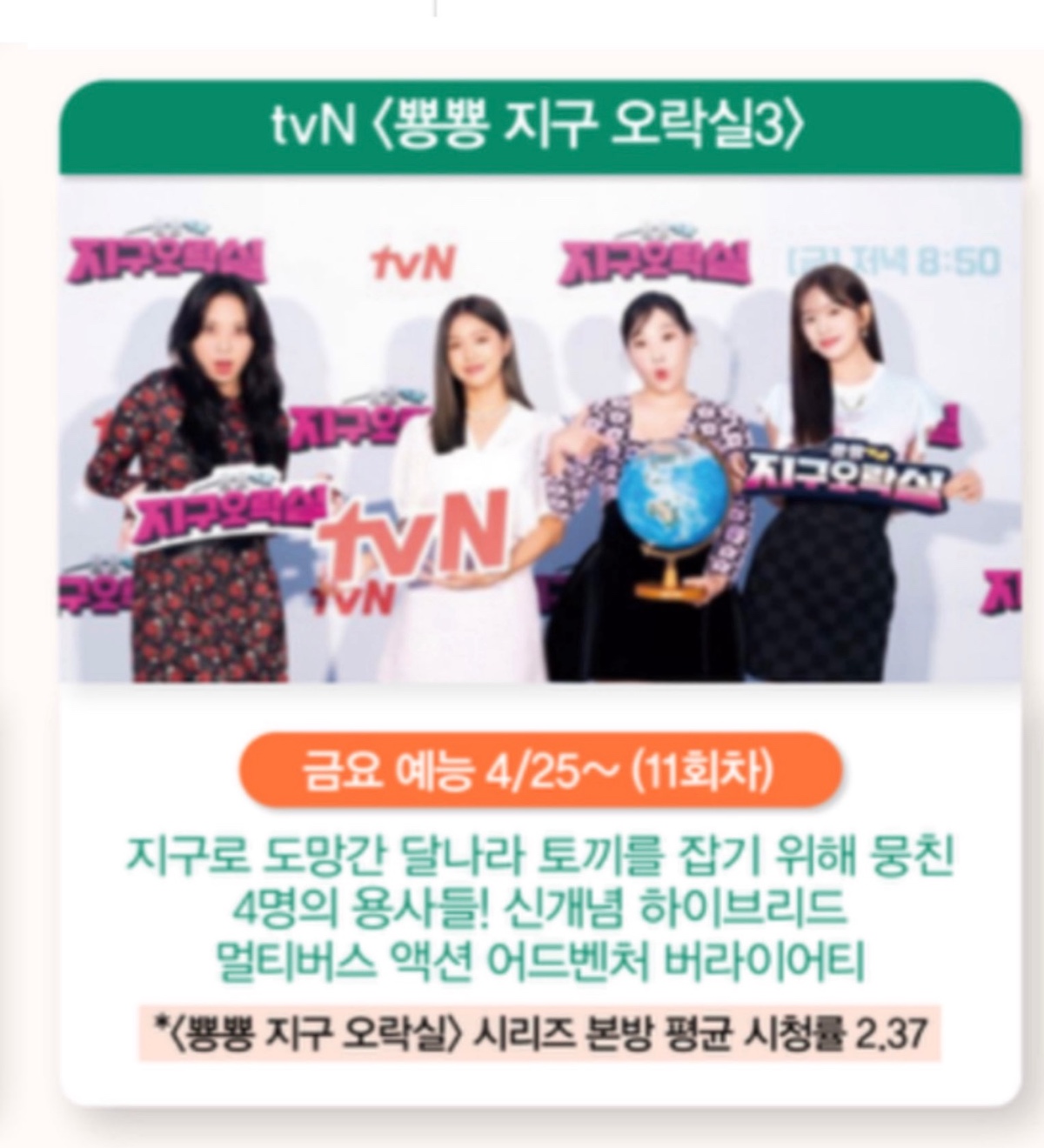 [스크랩] [흥미돋]tvN <뿅뿅 지구오락실3> 4/25 (금) 첫 방송 예정 작성자신비로운너의모습|작성시간25.03.12|조회수7,213 목록 댓글 15 글자크기 작게가 글자크기 크게가 출처: https://www.dmitory.com/issue/356787238 다음검색 스크랩 원문 : *여성시대* 차분한 20대들의 알흠다운 공간 현재 게시글 추가 기능 열기 북마크 공유하기 신고 센터로 신고 댓글 댓글 15 댓글쓰기 답글쓰기 댓글 리스트 작성자나의 유일한 행운 | 작성시간 25.03.12 빨리!!!!!!! 작성자집에 맨날 가고 싶음 | 작성시간 25.03.12 미친!! 너무 좋아! 작성자샴푸냥 | 작성시간 25.03.12 개같이 기대중 작성자117:00 | 작성시간 25.03.12 드디어!!!!! 작성자소주맥주 | 작성시간 25.03.12 드뎌 댓글 전체보기