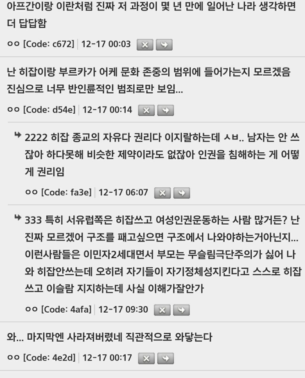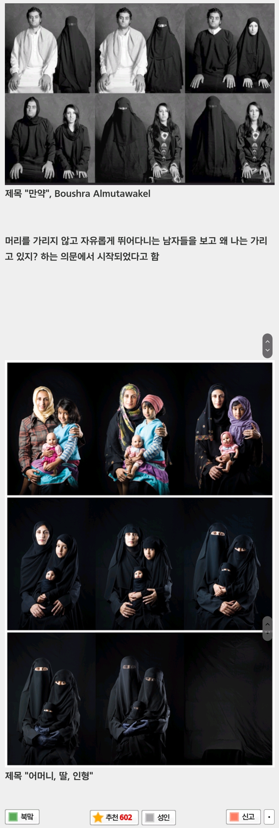 [스크랩] [흥미돋]예멘 출신 사진작가의 파워풀한 여성억압 미러링 작품 작성자들장미소녀간디|작성시간25.03.12|조회수4,200 목록 댓글 4 글자크기 작게가 글자크기 크게가 출처 : https://hygall.com/576817467해연갤 - ㅌㅆㅍ 예멘 출신 사진작가의 파워풀한 여성억압 미러링 작품해연갤, 해외연예갤러리, 영화, 드라마, 배우, 가수, 밴드, 모델, 연예인, 게임, 애니, 스포츠hygall.com 다음검색 스크랩 원문 : *여성시대* 차분한 20대들의 알흠다운 공간 현재 게시글 추가 기능 열기 북마크 공유하기 신고 센터로 신고 댓글 댓글 4 댓글쓰기 답글쓰기 댓글 리스트 작성자끝까지붙잡기 | 작성시간 25.03.12 와... 작성자아보카도추가요 | 작성시간 25.03.12 작가 홈페이지 가면 작품 더 볼 수 있음! https://boushraart.com/ 작성자주말좋아 | 작성시간 25.03.12 소름돋았어... 작성자응용외과학 | 작성시간 25.03.12 진짜 미친짓인듯여성탄압 언제 사라질까... 댓글 전체보기