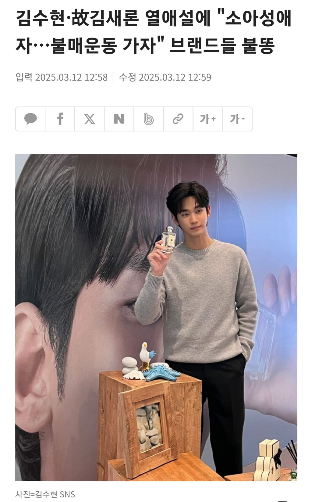 불똥은 김수현이 모델로 있는 향수 브랜드에도 튀었다. 그가 향수 제품을 홍보하고 있는 게시물에 "불매운동 가자", "보이콧", "BOIKOTTTT & BLACKLIST" 등의 댓글들이 도배되고 있는 것.