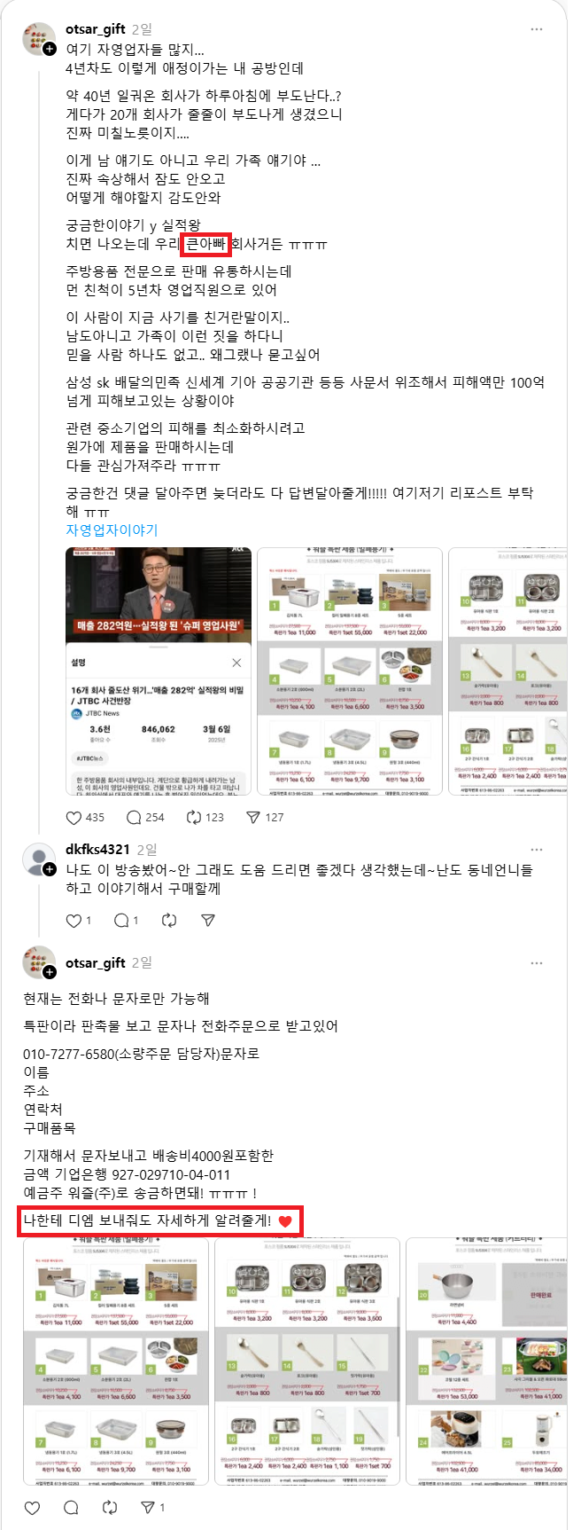 2. 홍보글 중 쓰레드에서 사기당한 회사와 친가 가족관계(성이 같아야함)라고 본인이 직접 DM으로 문의까지 받아가며 주문을 도와주려고 하는 글은 주장하지만, 본인 성(오씨)과 사기당한 회사 대표자(홍씨)의 성씨가 맞지 않음.