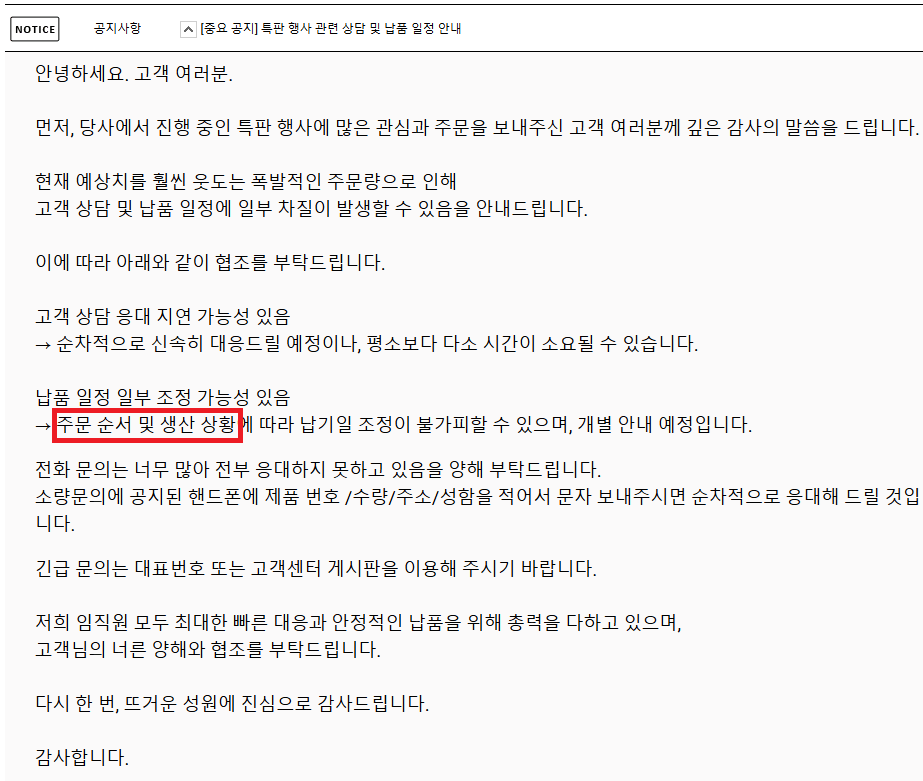 심지어 사기당한 물량 판다고 하면서, 공지글을 읽어보면 '주문 순서 및 생산 상황에 따라 납기일이 조정된다'는 문구로,