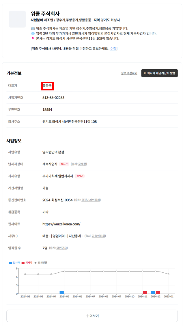 큰아빠 회사라고 했지만, 사업자 등록증 상 대표자와 워즐 홈페이지상 대표이사 모두 '홍'씨임.