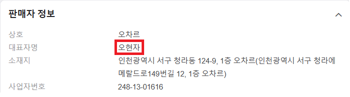 하지만 해당 업체 네이버 스마트 스토어를 들어가보면, 대표자 이름이 오현자 로 나와있음.