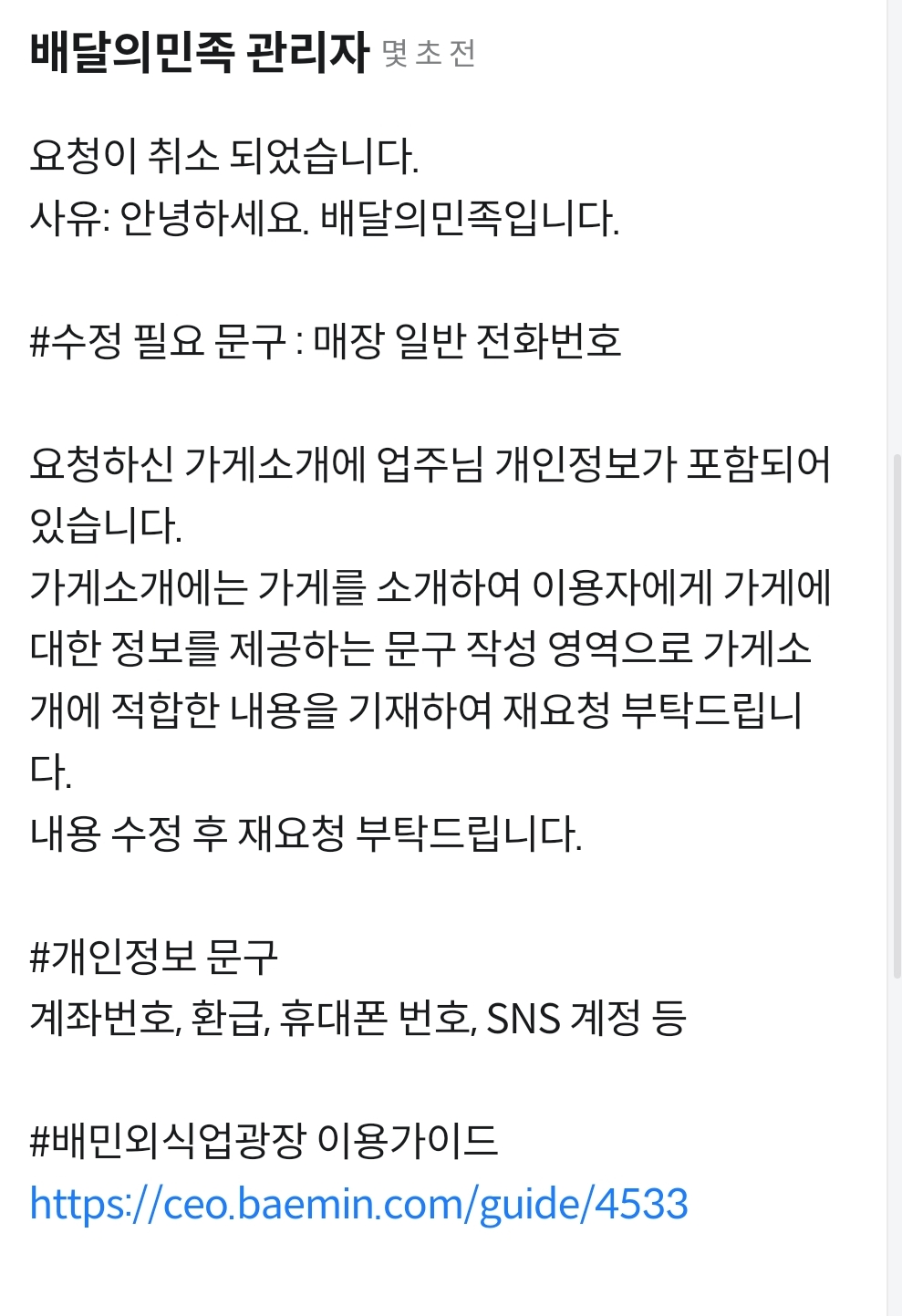 가게 전화번호를 개인정보라며 요청 취소
