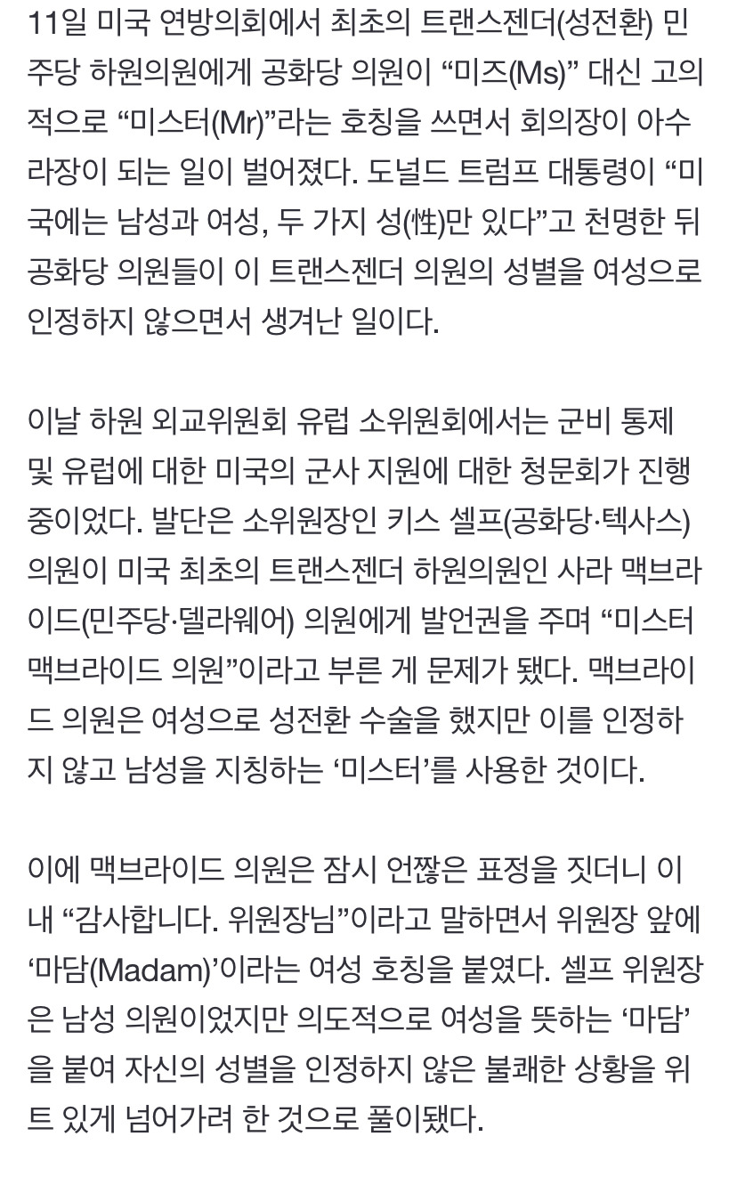 [여시뉴스데스크]美 트랜스젠더 의원에게 “미스터”... 공화 의원 발언에 회의장 아수라장 작성자개빡쳐|작성시간25.03.12|조회수3,622 목록 댓글 13 글자크기 작게가 글자크기 크게가 출처: https://n.news.naver.com/article/023/0003892978美 트랜스젠더 의원에게 “미스터”... 공화 의원 발언에 회의장 아수라장11일 미국 연방의회에서 최초의 트랜스젠더(성전환) 민주당 하원의원에게 공화당 의원이 “미즈(Ms)” 대신 고의적으로 “미스터(Mr)”라는 호칭을 쓰면서 회의장이 아수라장이 되는 일이 벌어졌n.news.naver.com전문출처 다음검색 현재 게시글 추가 기능 열기 북마크 공유하기 신고 센터로 신고 댓글 댓글 13 댓글쓰기 답글쓰기 댓글 리스트 작성자암살전문가 | 작성시간 25.03.12 미스터 맞잖아 작성자Le Cygne | 작성시간 25.03.12 미스터 그 자체 작성자정글포켓 | 작성시간 25.03.12 당연히 미스터지 작성자채규진 | 작성시간 25.03.12 맞말 작성자배규파요 | 작성시간 25.03.12 맞잖어 댓글 전체보기