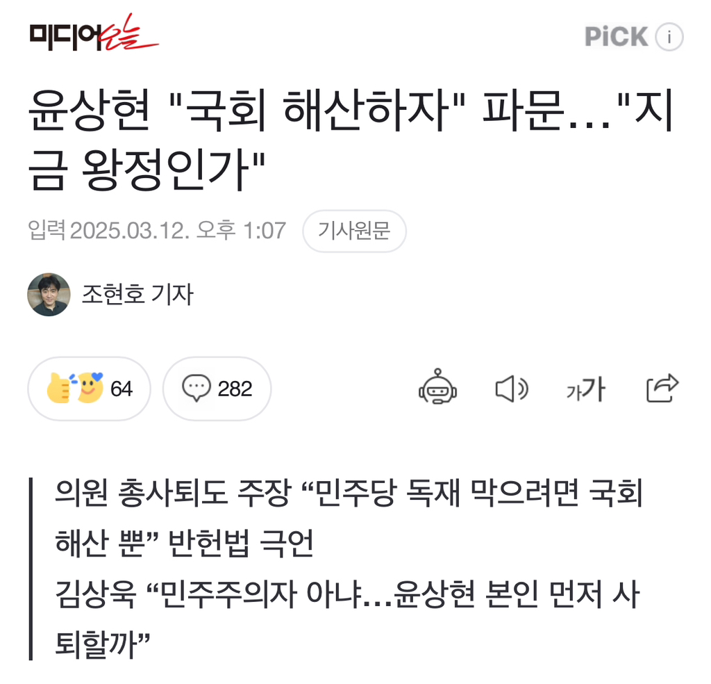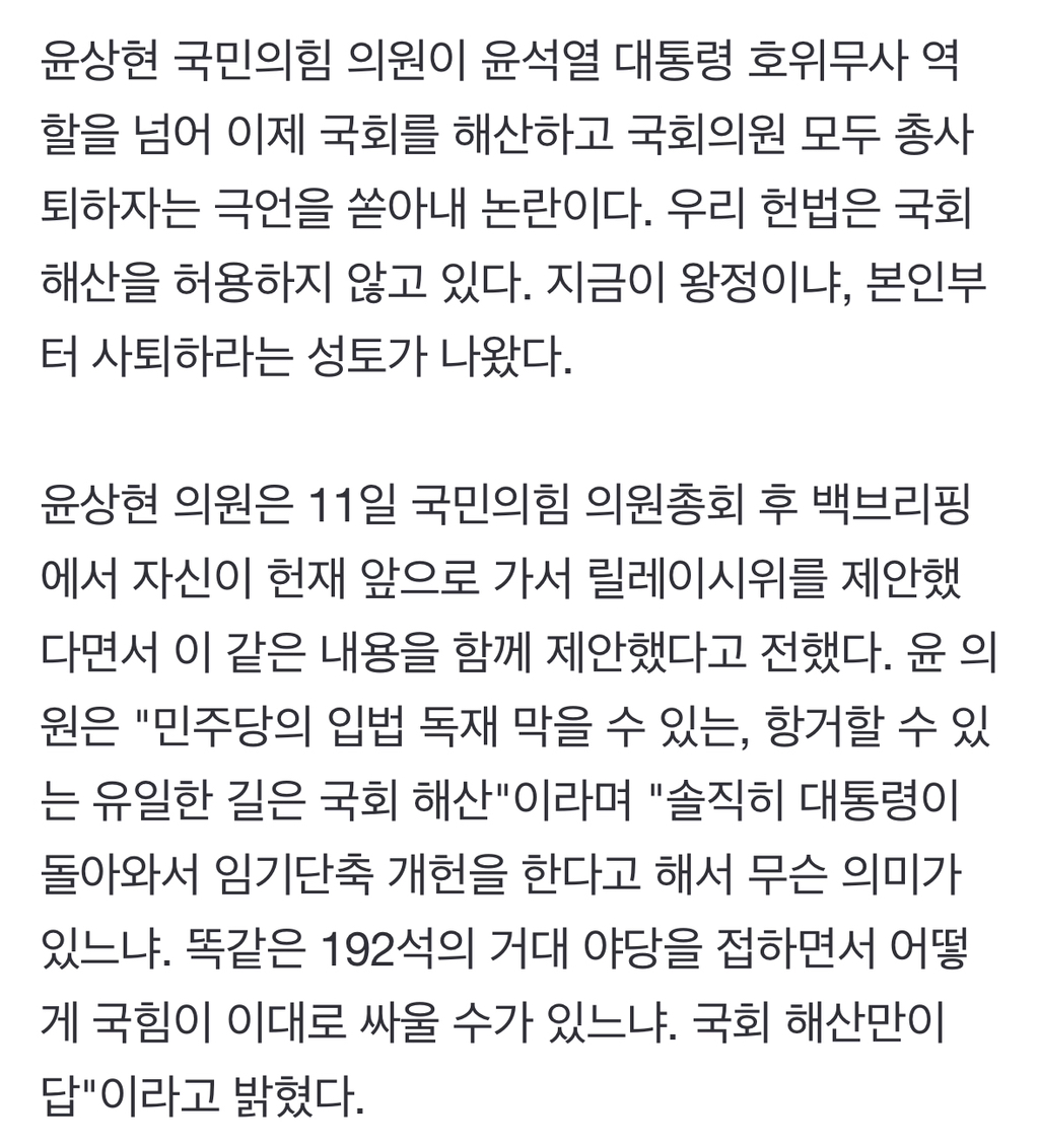 [여시뉴스데스크]윤상현 "국회 해산하자" 파문…"지금 왕정인가" 작성자소리앙|작성시간25.03.12|조회수1,406 목록 댓글 14 글자크기 작게가 글자크기 크게가 출처: https://naver.me/5YFy4YcT윤상현 "국회 해산하자" 파문…"지금 왕정인가"윤상현 국민의힘 의원이 윤석열 대통령 호위무사 역할을 넘어 이제 국회를 해산하고 국회의원 모두 총사퇴하자는 극언을 쏟아내 논란이다. 우리 헌법은 국회 해산을 허용하지 않고 있다. 지금n.news.naver.com전문출처 다음검색 현재 게시글 추가 기능 열기 북마크 공유하기 신고 센터로 신고 댓글 댓글 14 댓글쓰기 답글쓰기 댓글 리스트 작성자형 나 먼저가네 | 작성시간 25.03.12 니만 사퇴하면 돼 작성자시위가는여시 | 작성시간 25.03.12 전두환 사위답다 작성자냥배츄 | 작성시간 25.03.12 정신이 나갔구나 작성자임쫀득 | 작성시간 25.03.13 먼저 그만두시면 되겠습니다 작성자광안리뷰 | 작성시간 25.03.13 감히 국민들의 대변인들을 건드려?? 너는 의원역할 안하고 비리만 저질렀으니 세금 내놓고 재기해라 댓글 전체보기