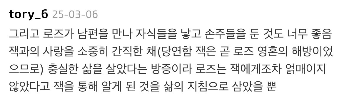 작성자무엄하도다 작성시간 25.03.12 와 잭의 사랑은 그대로 간직하고 꿋꿋하게 살면서 새 가정 이룬거... 그동안은 몰랐는데 여시 글 덕에 알게됨..
