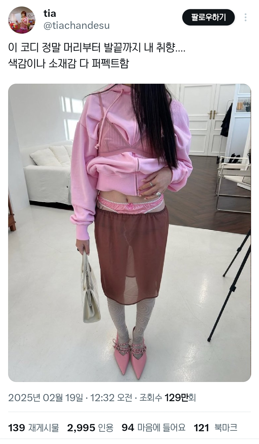 [흥미돋]트윗에서 인용 터진 코디 작성자Ihiridihi|작성시간25.03.12|조회수73,728 목록 댓글 298 글자크기 작게가 글자크기 크게가 출처: 여성시대 Ihiridihi 참 ⋯ 무슨 말을 해야할지 ⋯ 저 트윗러도 퍼온 사진인듯그렇답니다 무지성 인신공격❌️ 트젠아님 여자분이셔 코디에 대한 이야기만 합시다 다음검색 현재 게시글 추가 기능 열기 북마크 공유하기 신고 센터로 신고 댓글 댓글 298 댓글쓰기 답글쓰기 댓글 리스트 작성자TI OWNER FAKER | 작성시간 25.03.13 아 깜짝이야 작성자스우파그여자못잊어모니카 | 작성시간 25.03.13 속옷을 속에 안입으면 그게 겉옷이지 속옷이냐 작성자대빵살려조요 | 작성시간 25.03.13 근데 유행이라고 하는데 진짜 변태홍인할배만 좋아할것같아 작성자착짱죽짱 | 작성시간 25.03.13 요정이 시킨거겠지.. 작성자냥르장머리 | 작성시간 25.03.14 여자가오 다 뒤짐 댓글 전체보기