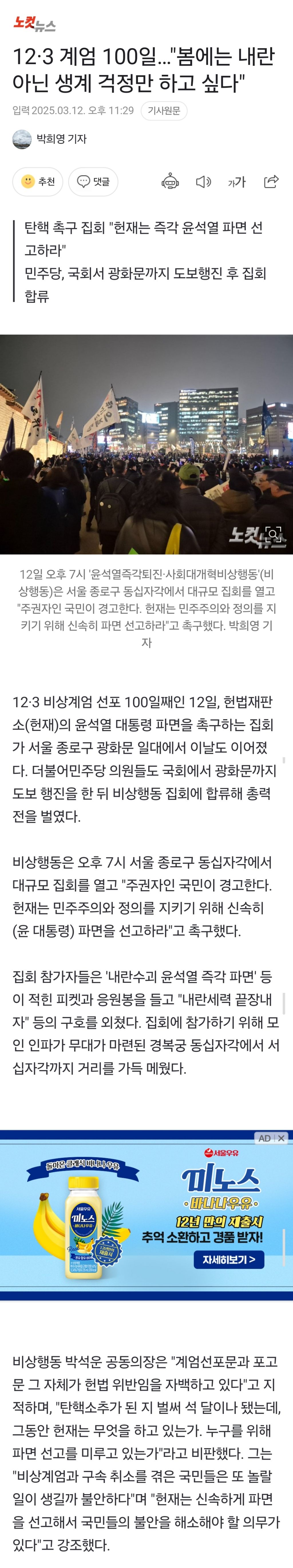 [여시뉴스데스크]12·3 계엄 100일…"봄에는 내란 아닌 생계 걱정만 하고 싶다" 작성자퇴사하고싶고그런상태|작성시간25.03.13|조회수1,408 목록 댓글 33 글자크기 작게가 글자크기 크게가 출처: https://n.news.naver.com/article/079/0004001396?sid=10212·3 계엄 100일…"봄에는 내란 아닌 생계 걱정만 하고 싶다"12·3 비상계엄 선포 100일째인 12일, 헌법재판소(헌재)의 윤석열 대통령 파면을 촉구하는 집회가 서울 종로구 광화문 일대에서 이날도 이어졌다. 더불어민주당 의원들도 국회에서 광화문까지 도n.news.naver.com 다음검색 현재 게시글 추가 기능 열기 북마크 공유하기 신고 센터로 신고 댓글 댓글 33 댓글쓰기 답글쓰기 댓글 리스트 답댓글 작성자윤돼지 사형 완 | 작성시간 25.03.13 아 답댓글 작성자윤돼지 사형 완 | 작성시간 25.03.13 줘!!!!! 작성자여름평생 | 작성시간 25.03.13 진짜 제발… 아름다운 봄을 맞이하게 해주세요 작성자눈송별 | 작성시간 25.03.13 내 말이.. 작성자대기업의이기적선행 | 작성시간 25.03.13 댓완 댓글 전체보기
