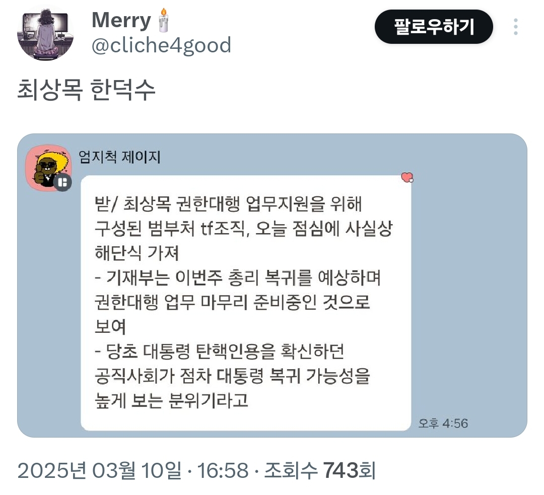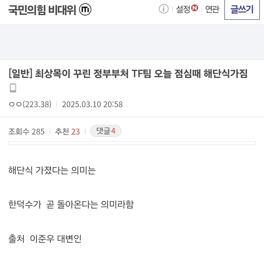 [흥미돋]최상목 tf팀 해단식함-> 한덕수 총리 복귀를 준비중이란 뜻 작성자콩치즈콘치즈|작성시간25.03.13|조회수6,043 목록 댓글 65 글자크기 작게가 글자크기 크게가 출처: 쓰레기 갤에서 훔쳐옴https://x.com/cliche4good/status/1899007049188675590?t=XVegumEXE4aPyY9MpNF0GA&s=19 다음검색 현재 게시글 추가 기능 열기 북마크 공유하기 신고 센터로 신고 댓글 댓글 65 댓글쓰기 답글쓰기 댓글 리스트 작성자감귤러머 | 작성시간 25.03.13 와..... 작성자느개비다ㅉㅉ | 작성시간 25.03.13 지랄ㅋㅋㅋ 작성자국민의힘 지역구에서 소비X 불매 | 작성시간 25.03.13 미쳤다 진짜... 작성자새콤달콤핑 | 작성시간 25.03.13 좆같아진짜 작성자하는일마다 잘되는여시 | 작성시간 25.03.14 진짜 개나대네 댓글 전체보기