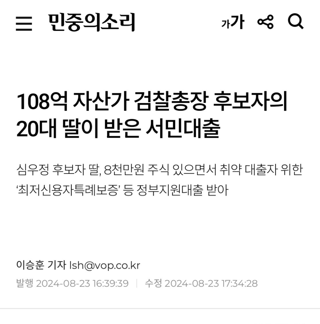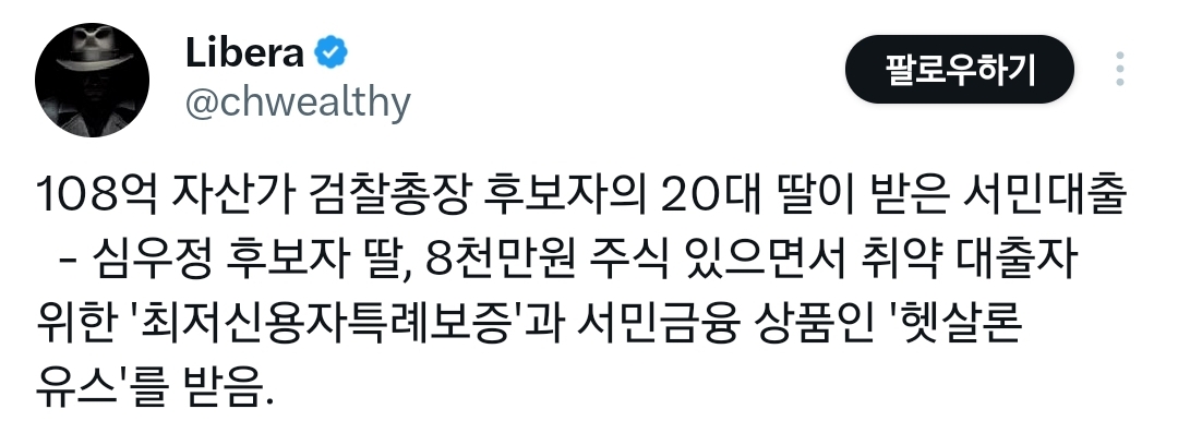 [기타]108억 자산가 검찰총장 후보자의 20대 딸이 받은 서민대출 작성자초장없는 브로콜리|작성시간25.03.13|조회수18,996 목록 댓글 171 글자크기 작게가 글자크기 크게가 출처: https://x.com/chwealthy/status/1899304882688942141?t=zZ_5W8oHAH2nKbhnZHTbNA&s=19상대적 박탈감 외치던 사람들 다 어디감 다음검색 현재 게시글 추가 기능 열기 북마크 공유하기 신고 센터로 신고 댓글 댓글 171 댓글쓰기 답글쓰기 댓글 리스트 작성자무삥 | 작성시간 25.03.13 깜빵가 니네 다 쳐 가 작성자알렉산더의아이스크림스쿱 | 작성시간 25.03.13 조국처럼 끈질기게 파보라고 작성자강쥐들언니 | 작성시간 25.03.13 와 작성자으라차차차차차차 | 작성시간 25.03.14 와 대박 작성자댓굴 | 작성시간 25.03.15 어케받음 ㅅㅂ 나도 줘 댓글 전체보기
