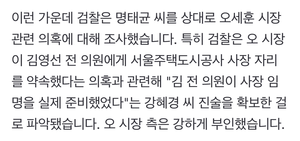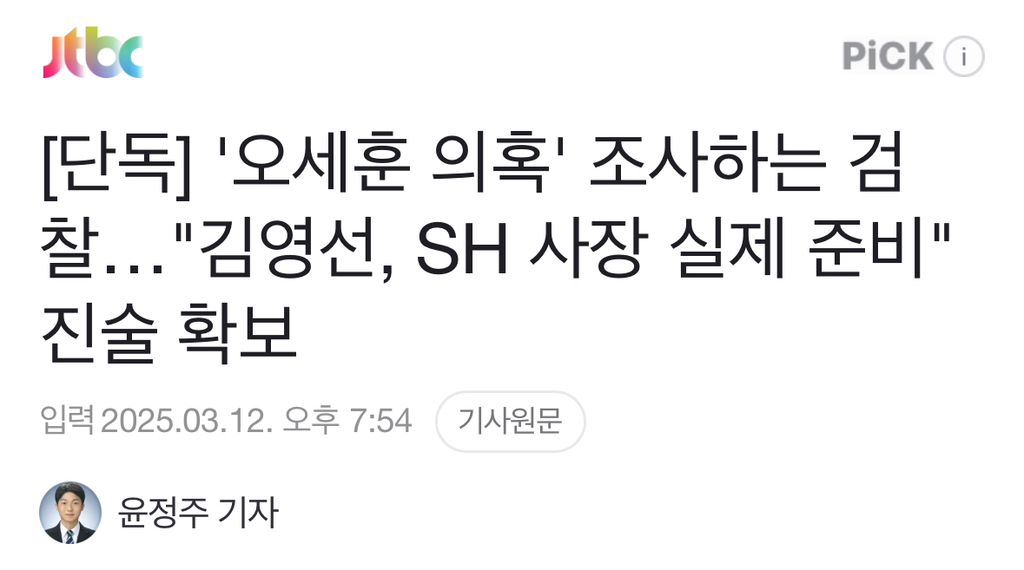 [여시뉴스데스크][단독] '오세훈 의혹' 조사하는 검찰…"김영선, SH 사장 실제 준비" 진술 확보 작성자소리앙|작성시간25.03.13|조회수827 목록 댓글 5 글자크기 작게가 글자크기 크게가 출처: https://naver.me/5IS8IjfC[단독] '오세훈 의혹' 조사하는 검찰…"김영선, SH 사장 실제 준비" 진술 확보이런 가운데 검찰은 명태균 씨를 상대로 오세훈 시장 관련 의혹에 대해 조사했습니다. 특히 검찰은 오 시장이 김영선 전 의원에게 서울주택도시공사 사장 자리를 약속했다는 의혹과 관련해 "김 n.news.naver.com전문출처 다음검색 현재 게시글 추가 기능 열기 북마크 공유하기 신고 센터로 신고 댓글 댓글 5 댓글쓰기 답글쓰기 댓글 리스트 작성자라피유벨 | 작성시간 25.03.13 오세훈만 파네 작성자스스새샌 | 작성시간 25.03.13 검찰에서 미는후보가 따로있나보네 예를들면 한동훈 작성자피치애플 | 작성시간 25.03.13 앗놋웃으로 노선정했나봐 작성자대한민국 대통령 이재명 | 작성시간 25.03.13 ㅋㅋㅋㅋㅋ 오세훈 이제 어디.가서 울어야 해 답댓글 작성자BadaLee | 작성시간 25.03.13 장마철에 빗물 넘치는 물구덩이 속에서 울어야지 머ㅠ 댓글 전체보기