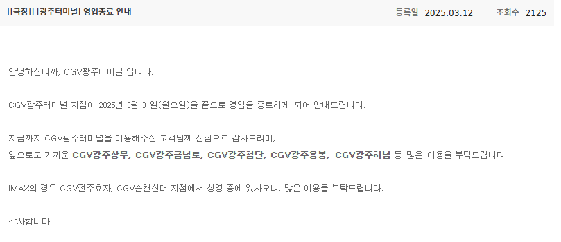 [흥미돋]CGV 광주터미널점 2025년3월31일 영업 종료 작성자나프탈렌향|작성시간25.03.13|조회수13,795 목록 댓글 28 글자크기 작게가 글자크기 크게가 출처: 여성시대 나프탈렌향http://www.cgv.co.kr/support/news/detail-view.aspx?idx=8099&page=1&type=2&searchtext=&searchfield=0&pb=Y공지/뉴스 < 고객센터 | 깊이 빠져 보다, CGV안녕하십니까, CGV광주터미널 입니다. CGV광주터미널 지점이 2025년 3월 31일(월요일)을 끝으로 영업을 종료하게 되어 안내드립니다. 지금까지 CGV광주터미널을 이용해주신 고객님께 진심으로 감사www.cgv.co.kr 다음검색 현재 게시글 추가 기능 열기 북마크 공유하기 신고 센터로 신고 댓글 댓글 28 댓글쓰기 답글쓰기 댓글 리스트 작성자움뫄쉿다 | 작성시간 25.03.13 공사 끝나면 들어오걸아 작성자코니냐 | 작성시간 25.03.13 아 안돼...아이맥스...그리고 거기가 영화 그나마 다양하게 많이 틀어주는데 ㅠㅠㅠㅠㅠ 작성자ㅇㅇㄴ로 | 작성시간 25.03.13 헐 그나마 여기가 괜찮은디 작성자BadaLee | 작성시간 25.03.13 여기없어지고 머 들어오는데.. 작성자와뭐래 | 작성시간 25.03.14 이참에 메가박스로 다 옮겨주라리클라이너석 망하몀 안돼 절대지켜 댓글 전체보기