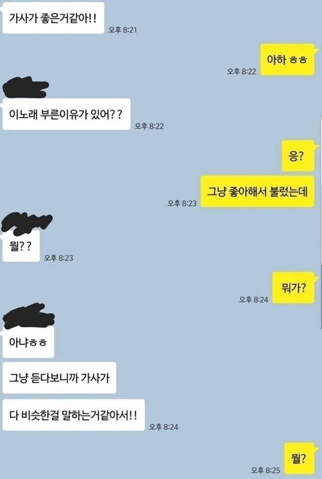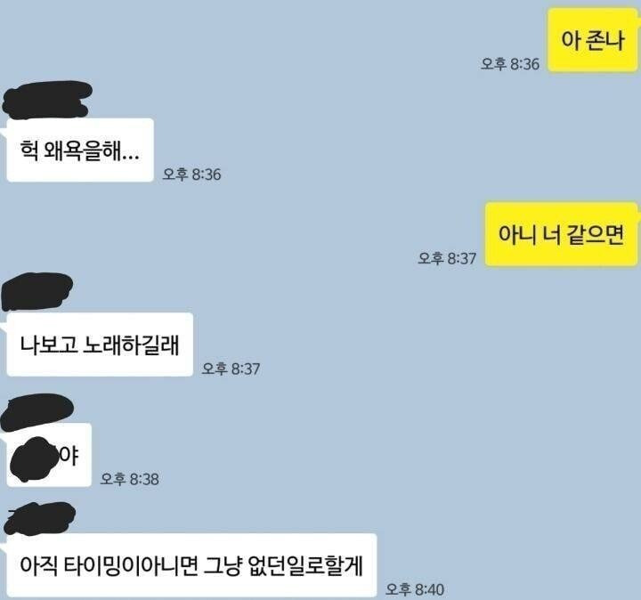 [흥미돋]약혐) 여초남초 대통합된 한 여시의 카톡...jpg 작성자생각대로쥐랄|작성시간25.03.13|조회수41,279 목록 댓글 189 글자크기 작게가 글자크기 크게가 출처: 여성시대원래 유명한 고전 여시글이었는데 원글은 없어지고 오만군데 수출돼서 뽀려옴상황: 오른쪽이 여시였고무리지어서 노래방 간 뒤로 한명한테 연락이왔다고 울분을 토하는글이었다내요남초에서도 살인 안난게 용하다그럼 다음검색 현재 게시글 추가 기능 열기 북마크 공유하기 신고 센터로 신고 댓글 댓글 189 댓글쓰기 답글쓰기 댓글 리스트 작성자개똥이 똥개 | 작성시간 25.03.13 한남죽어같은노래 안나오냐 그거만 불러야겟네 작성자긍갈 | 작성시간 25.03.14 시발 ㅋ 말투부터 누가봐도 관심 1도 없다는걸 보여주는데 김칫국 개쳐마시고 있노 작성자맥북 | 작성시간 25.03.14 ㅋㅋㅋㅋㅋㅋㅋㅋㅋㅋㅋㅋㅋㅋㅋ 작성자데뷔 못 하면 죽는 병 걸림 | 작성시간 25.03.14 후기 개궁금 작성자여름오지마 | 작성시간 25.03.16 아 이거 여시가 원출처였어? 살인안난게 용하댘ㅋㅋㅋㅋㅋㅋㅋ 댓글 전체보기