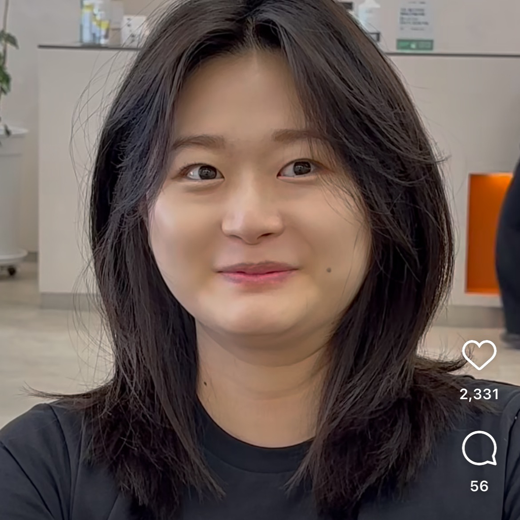 : 머리가 길어서 시선이 아래쪽으로 가고
