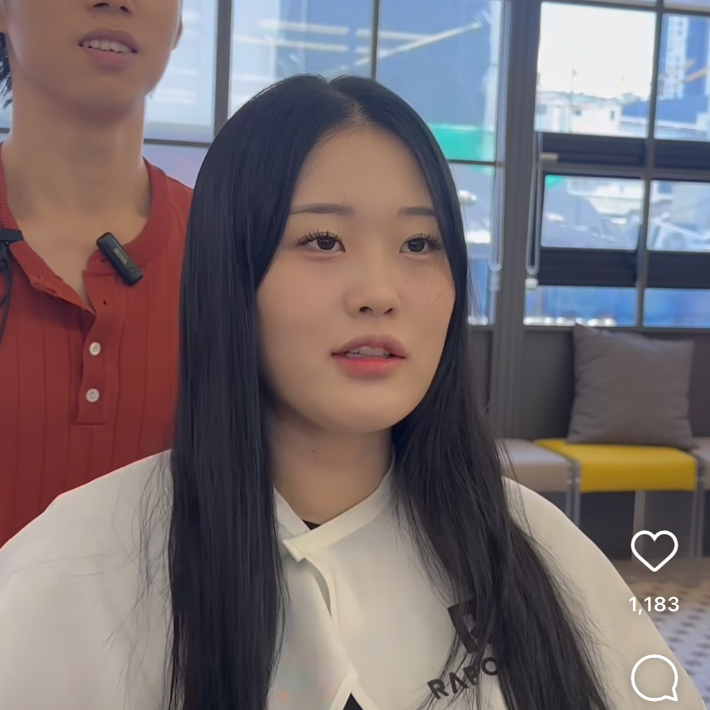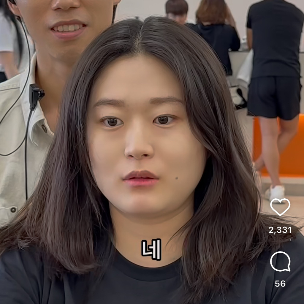 착 가라앉은 긴머리가 볼살을 부각하고 있다