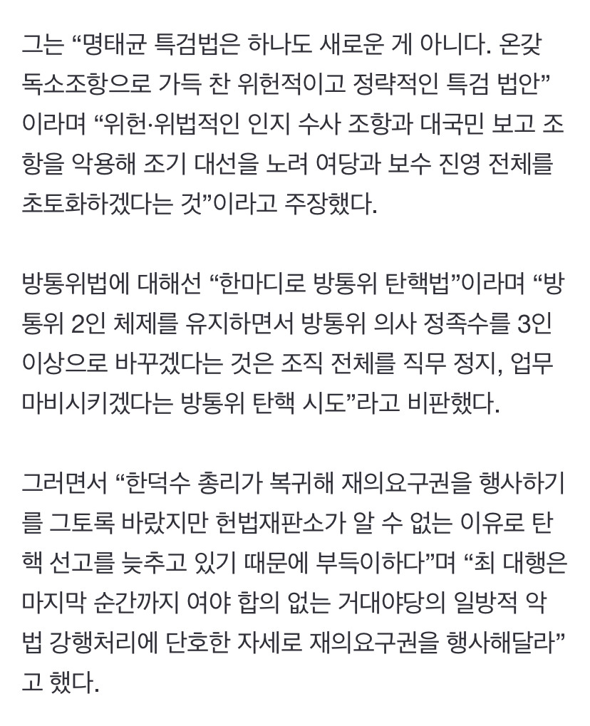 [여시뉴스데스크]권성동 “崔대행, 명태균특검법·방통위법 재의요구권 행사 해달라” 작성자개빡쳐|작성시간25.03.13|조회수506 목록 댓글 3 글자크기 작게가 글자크기 크게가 출처: https://n.news.naver.com/article/025/0003426631?sid=100[속보] 권성동 “崔대행, 명태균특검법·방통위법 재의요구권 행사 해달라”권성동 국민의힘 원내대표는 13일 최상목 대통령 권한대행 부총리 겸 기획재정부 장관에게 명태균특검법·방통위법에 대한 재의요구권(거부권) 행사를 요청했다. 권 원내대표는 이날 오후 국회 n.news.naver.com특검을 거부하면 무 ㅓ다? 다음검색 현재 게시글 추가 기능 열기 북마크 공유하기 신고 센터로 신고 댓글 댓글 3 댓글쓰기 답글쓰기 댓글 리스트 작성자국짐해체 | 작성시간 25.03.13 거부권은 써도되고 재판관 임명권은 쓰면 안되고 걍 해체해라 ㅅㅂ놈들아 작성자냬가웉기늗냜 | 작성시간 25.03.13 똥배짱 진짜 ㅋㅋㅋ 작성자저리로날아 | 작성시간 25.03.13 한편이라 좋~~겠다 진짜 댓글 전체보기