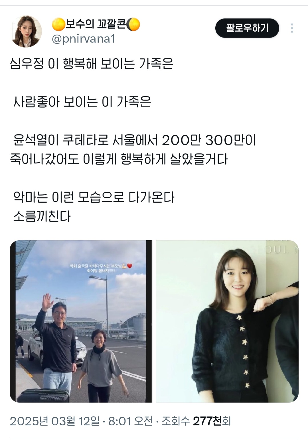 [칵.cxxx]윤석열이 쿠테타로 서울에서 200만 300만이 죽어나갔어도 이렇게 행복하게 살았을 가족 작성자막방울|작성시간25.03.13|조회수11,788 목록 댓글 55 글자크기 작게가 글자크기 크게가 출처: 여성시대 막방울ㄹㅇ 띵문 소름돋아윤석열 고의 석방시켜준 검찰총장 심우정네 가족https://m.cafe.daum.net/subdued20club/ReHf/5241096?svc=cafeapp심우정 가족관계출처: https://www.ddanzi.com/free/8371076671. 처 김성은https://m.cmcvincent.or.kr/page/doctor/18/D0001306가톨릭대학교 성빈센트병원가톨릭대학교 성빈센트병원에서는 환자들이 진료과, 클리닉, 전문센터의 의료진 m.cafe.daum.net 다음검색 현재 게시글 추가 기능 열기 북마크 공유하기 신고 센터로 신고 댓글 댓글 55 댓글쓰기 답글쓰기 댓글 리스트 작성자느개비알파메일로메일보냄 | 작성시간 25.03.13 에효 시발.. 작성자연느사랑혀 | 작성시간 25.03.13 저 딸은 안쪽팔릴까? 작성자굽시늬우스의 띠 | 작성시간 25.03.13 끼리끼리다.... 작성자또또또오오오리 | 작성시간 25.03.13 창피함을 알아라 작성자최정원 | 작성시간 25.03.13 열받아 댓글 전체보기