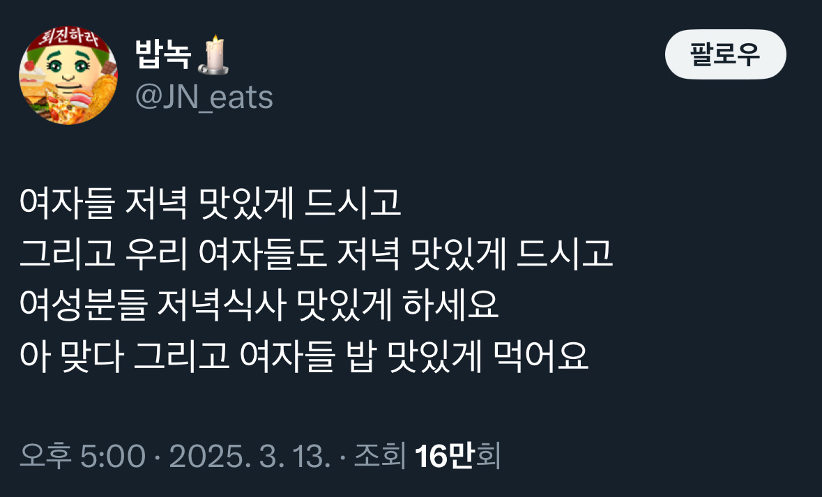 작성자전 이만 갑오개혁ㅋㅋ 작성시간 25.03.13 모든 여자들 밥 든든히 먹고 모든 게 편안한 밤 보내길 바라