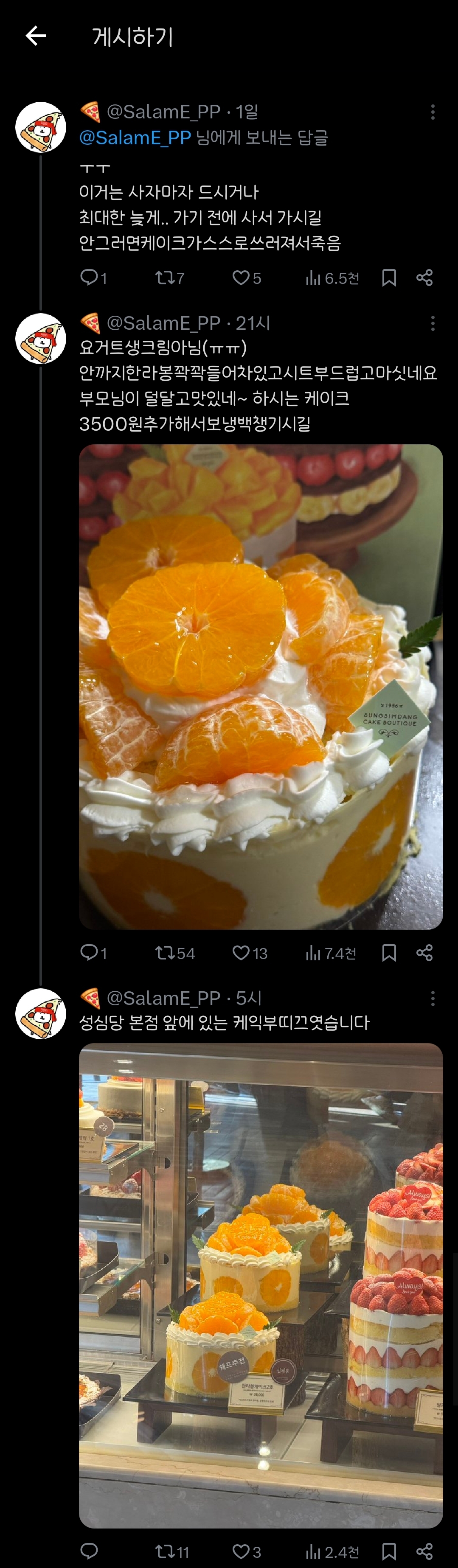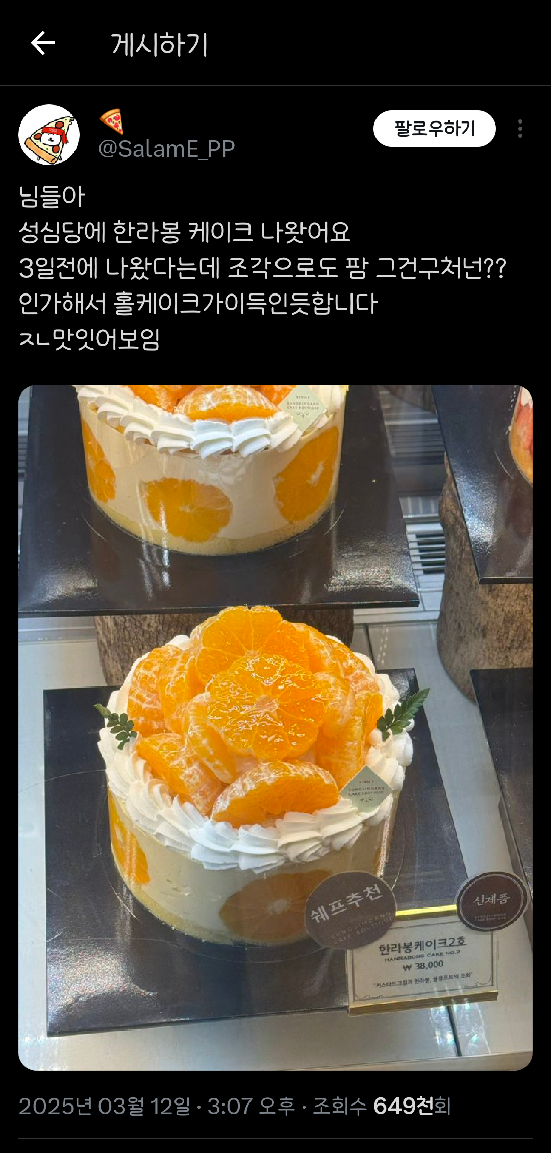 [흥미돋]님들아 성심당에 한라봉 케이크 나왓어요 작성자(본인 닉네임),|작성시간25.03.13|조회수59,691 목록 댓글 32 글자크기 작게가 글자크기 크게가 출처: 여성시대 (본인 닉네임),https://x.com/SalamE_PP/status/1899703839944769901?s=19 다음검색 현재 게시글 추가 기능 열기 북마크 공유하기 신고 센터로 신고 댓글 댓글 32 댓글쓰기 답글쓰기 댓글 리스트 작성자큐쮸 | 작성시간 25.03.13 아니! 지난 주 토요일에는 없었는데ㅠㅜㅜㅜ 작성자돓려죠요ㄷㄷ | 작성시간 25.03.13 맛있겠다 내입으로 컴온 작성자홈런볼런홈 | 작성시간 25.03.13 옆에 화이트시루 존맛.... 작성자프로먹방러 | 작성시간 25.03.13 진짜 미쳤음 딸기시루보다 딸기설기가 훨맛잇어요 딸기설기 꼭 먹어보슈.. 답댓글 작성자닥쳐..좀...뭘알고나말해... | 작성시간 25.03.14 222 간김에 시루 설기 둘 다 사왔는데 설기가 더 맛있어 댓글 전체보기