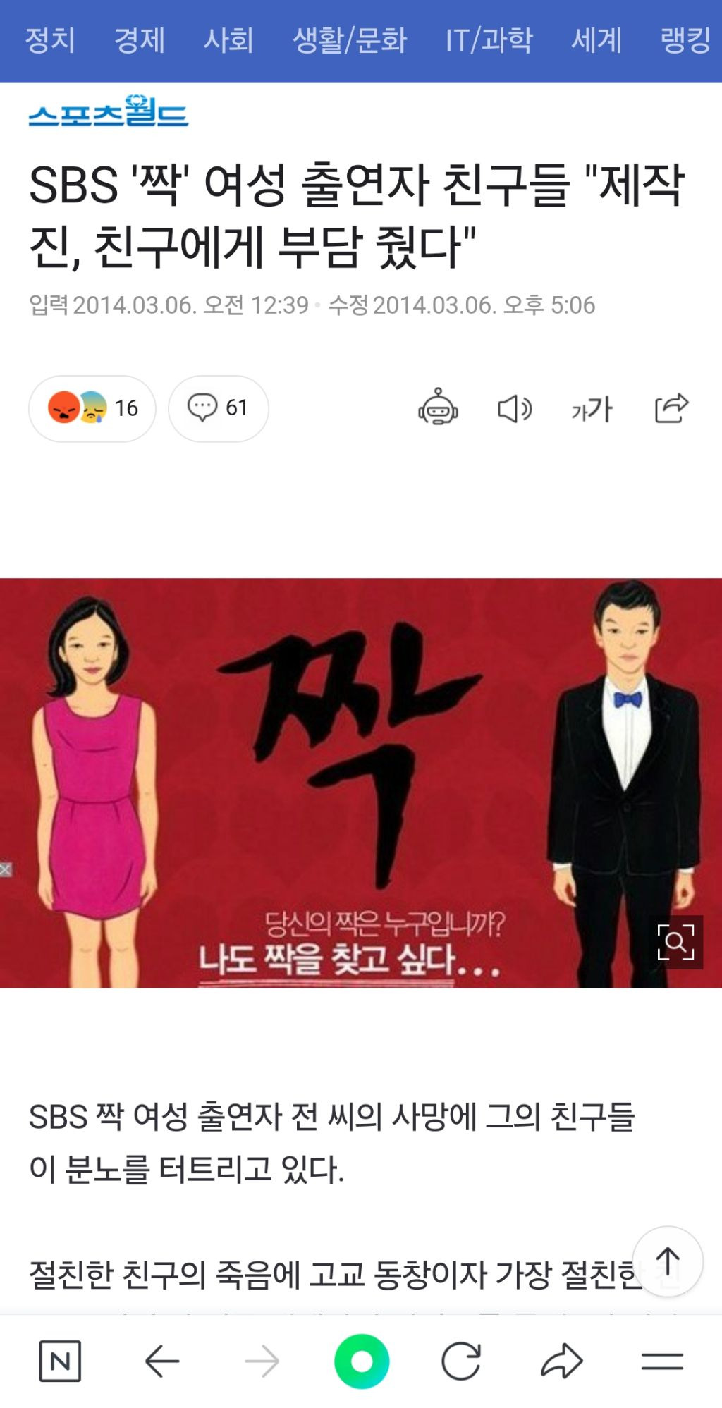 10년전 있었던 짝 출연자 사망 사건이 생각났어.