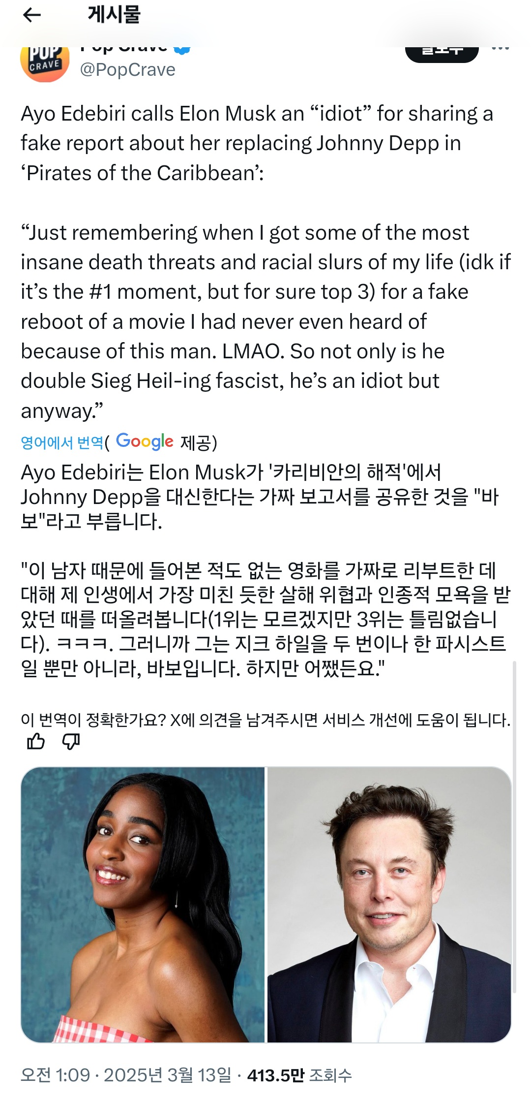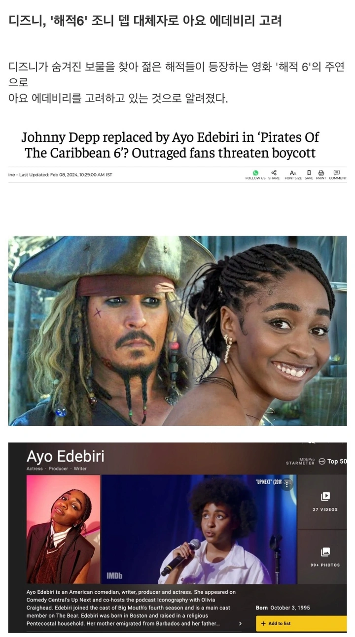 "흑인 여성" 아요 에데비리로 교체될거란 찌라시가 퍼짐