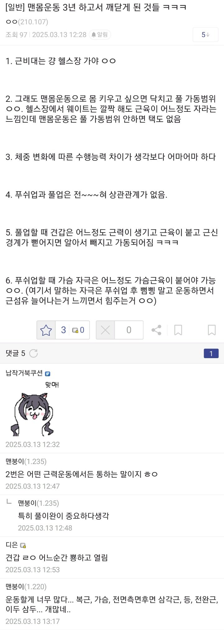 [스크랩] [흥미돋]맨몸운동 3년 하고서 깨달은 것들 작성자이굴루|작성시간25.03.14|조회수19,807 목록 댓글 13 글자크기 작게가 글자크기 크게가 다음검색 스크랩 원문 : 이종격투기 현재 게시글 추가 기능 열기 북마크 공유하기 신고 센터로 신고 댓글 댓글 13 댓글쓰기 답글쓰기 댓글 리스트 작성자라피키 | 작성시간 25.03.14 맨몸이 진짜 근육같더라 오래가는 근육 작성자올리버 잭슨 코헨 | 작성시간 25.03.14 이 모든걸 가능하게 하는 건 요가!!~~ 작성자기아우승 | 작성시간 25.03.14 그래서체조선수들이 몸이 좋은가봐 작성자에엥???!? | 작성시간 25.03.14 맨몸운동 잘하는게 ㄹㅇ 철인같음 작성자드르르르르르으르륵 | 작성시간 25.03.14 풀이완 개어려워 댓글 전체보기