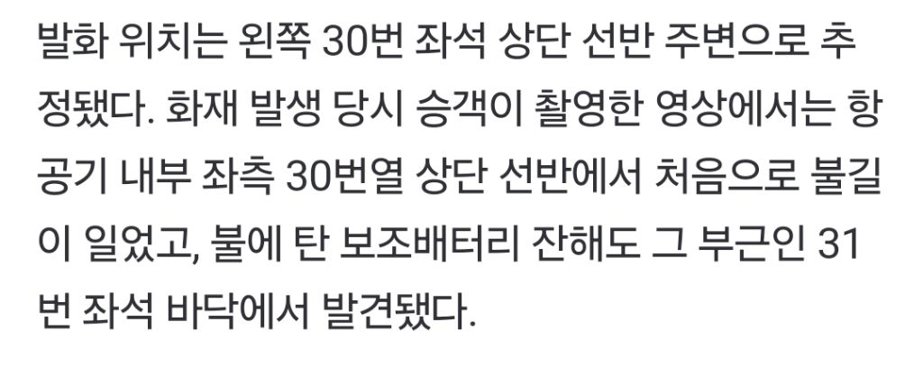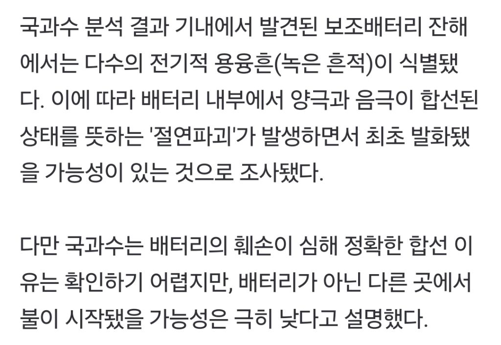 [여시뉴스데스크]에어부산 화재원인 '보조배터리 합선' 추정…"다른 가능성 희박"(종합) 작성자김 재영|작성시간25.03.14|조회수5,033 목록 댓글 4 글자크기 작게가 글자크기 크게가 출처: https://n.news.naver.com/article/001/0015265327?sid=102에어부산 화재원인 '보조배터리 합선' 추정…"다른 가능성 희박"(종합)항철위, 국과수 화재 감정결과 발표…왼쪽 30번 좌석 상단 선반 주변서 발화 지난 1월 28일 김해국제공항에서 이륙을 준비하던 에어부산 홍콩행 BX391편 여객기에서 발생한 화재는 보조배터리 내n.news.naver.com 다음검색 현재 게시글 추가 기능 열기 북마크 공유하기 신고 센터로 신고 댓글 댓글 4 댓글쓰기 답글쓰기 댓글 리스트 삭제된 댓글입니다. 답댓글 작성자멜론순위 | 작성시간 25.03.14 아무래도 여행가면 캐리어나 짐가방 많이 무겁고 빡빡하게 챙기다보니 그 짐무게에 눌리면 그럴수있대 작성자너와의모든지금 | 작성시간 25.03.14 보조배터리를 잘 만들어도 발생하는 문제인가.. 작성자나라꼬리꼬리꼬리 | 작성시간 25.03.14 보조배터리 보험으로도 커버안되겠다.. 댓글 전체보기