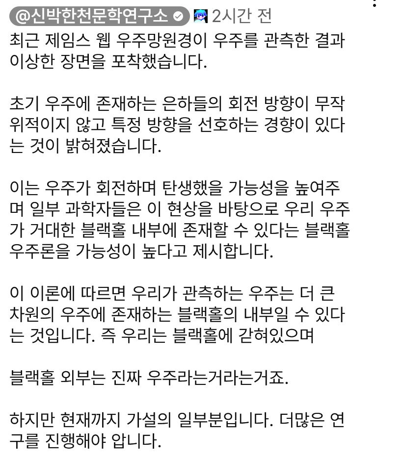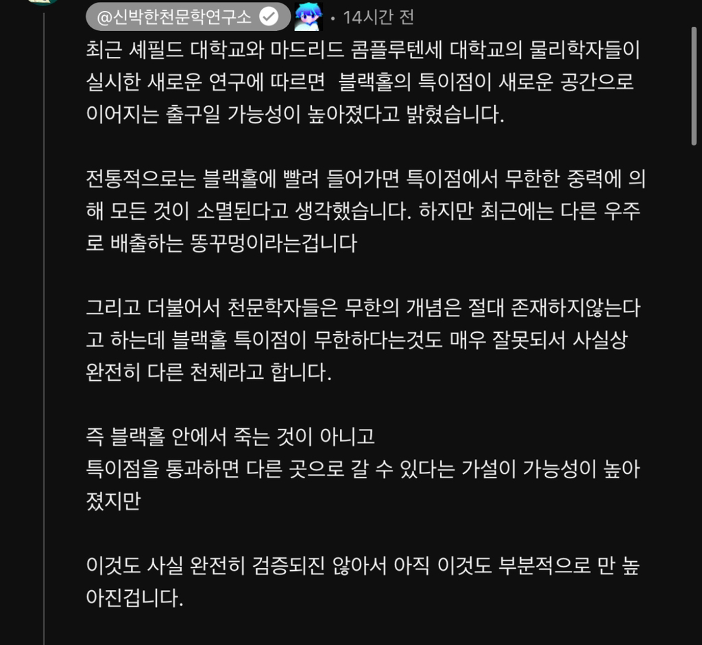 [흥미돋]사실은 지구가 블랙홀 안에 있다는 가설 작성자랩틸리언정기모임|작성시간25.03.14|조회수9,245 목록 댓글 71 글자크기 작게가 글자크기 크게가 출처: 여성시대 랩틸리언정기모임유튜브 신박한천문학연구소오오 신기 다음검색 현재 게시글 추가 기능 열기 북마크 공유하기 신고 센터로 신고 댓글 댓글 71 댓글쓰기 답글쓰기 댓글 리스트 작성자플래인크래커 | 작성시간 25.03.14 아 그러면 현재 우주의 블랙홀이 외부 우주로 나가는 출구가 된다거나 웜홀이론이 찐이라거나 이럴수도 있는건가 작성자iNtP | 작성시간 25.03.14 내보내주세요 작성자대방어먹고싶다 | 작성시간 25.03.14 화이트홀 이론은 가능성 없다며....? 작성자커리어 유목민 | 작성시간 25.03.14 블랙홀아 힘을 줘보걸아 작성자언니 나 사랑하는 개가 생겼어 | 작성시간 25.03.15 나 죽기전에 알려줘 댓글 전체보기