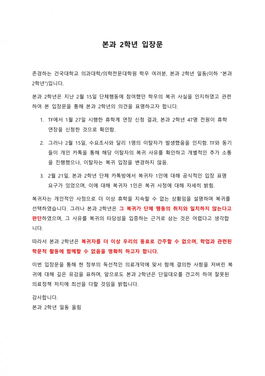 [기타]의대 본과 일동 : 복귀자는 더 이상 우리의 동료로 간주할 수 없으며, 학업과 관련된 학문적 활동에 함께할 수 없음을 명확히 하고자함