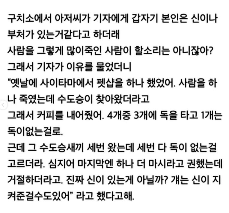 [스크랩] [흥미돋]일본의 한 스님이 겪은 소름돋는 실화...jpg 작성자Tory-|작성시간25.03.14|조회수4,611 목록 댓글 18 글자크기 작게가 글자크기 크게가 다음검색 스크랩 원문 : 도탁스 (DOTAX) 현재 게시글 추가 기능 열기 북마크 공유하기 신고 센터로 신고 댓글 댓글 18 댓글쓰기 답글쓰기 댓글 리스트 작성자무자성 | 작성시간 25.03.14 와 나 이 이야기 넘 좋아해서 며칠 전에 찾고있었는데... 올려줘서 고마워ㅋㅋㅋ 작성자Break of Dawn | 작성시간 25.03.14 와우 작성자Bellatrix Lestrange | 작성시간 25.03.14 와 신기하다 작성자아티스트베이커리쏘금빵 | 작성시간 25.03.14 개소름이다ㅜ 작성자갸아아앙 | 작성시간 25.03.15 와… 댓글 전체보기