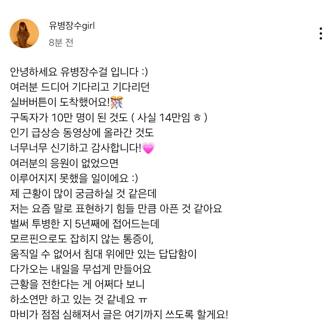 + 유병장수걸은 20대 암투병하는 유튜번데 최근에 호스피스 들어감..